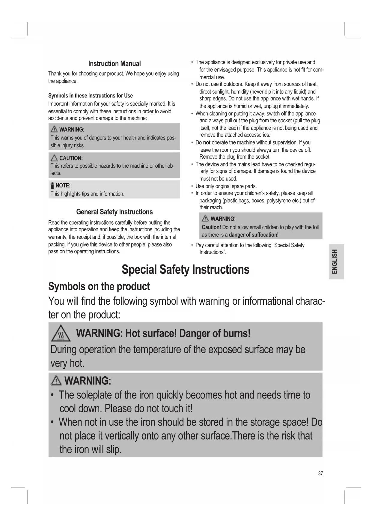 - Pay careful attention to the following “Special Safety Instructions”. Instruction Manual Thank you for choosing our product. We hope you enjoy using the appliance. Symbols in these Instructions for Use Important information for your safety is specially marked. It is essential to comply with these instructions in order to avoid accidents and prevent damage to the machine: