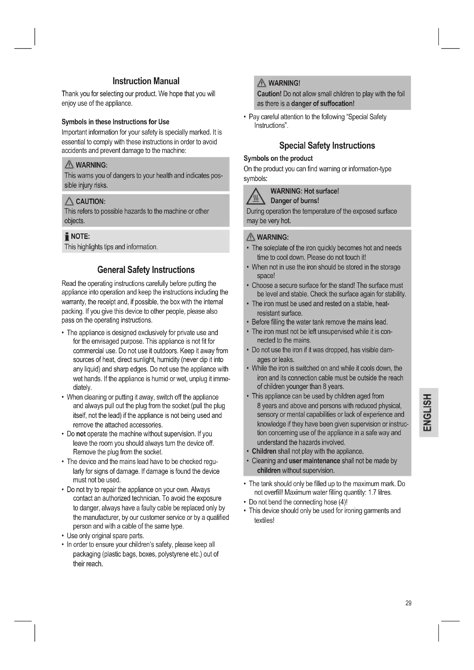 - This device should only be used for ironing garments and textiles! Instruction Manual Thank you for selecting our product. We hope that you will enjoy use of the appliance. Symbols in these Instructions for Use Important information for your safety is specially marked. It is essential to comply with these instructions in order to avoid accidents and prevent damage to the machine: