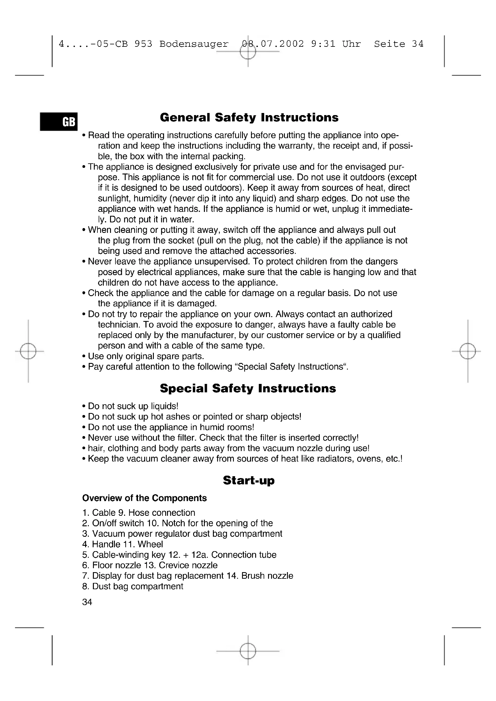 - Keep the vacuum cleaner away from sources of heat like radiators, ovens, etc.! Start-up Overview of the Components