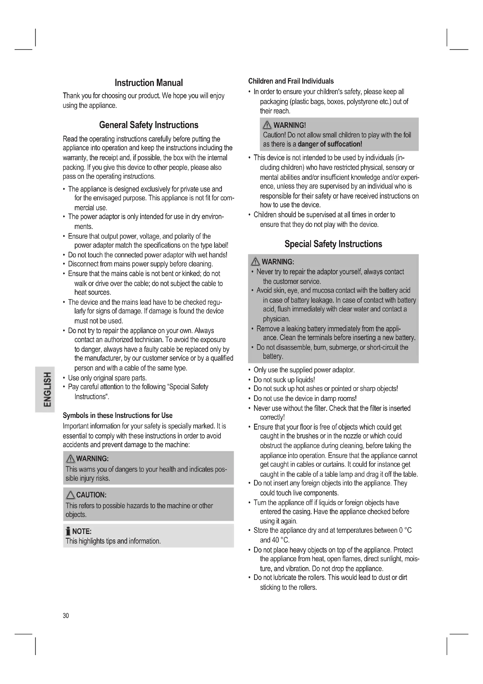This warns you of dangers to your health and indicates pos- sible injury risks. CAUTION: This refers to possible hazards to the machine or other objects. NOTE: This highlights tips and information. Children and Frail Individuals