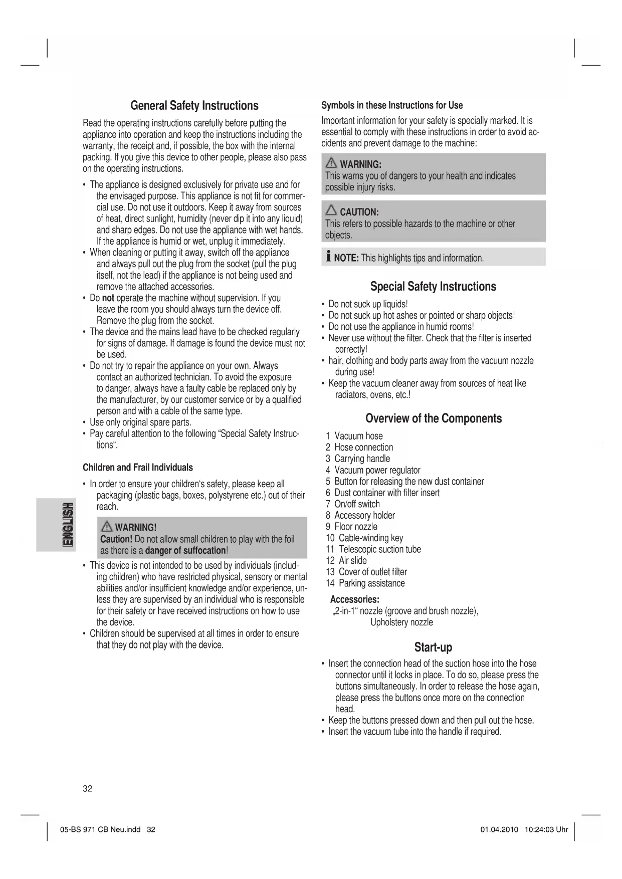 - To lock the device, release the key until you hear it lock in place. Nozzle accessories NOTE: The accessories are to be found in the holder on the telesco- pic tube. Upholstery nozzle: For vacuuming upholstery, curtains and in corners and crevices etc. Groove and brush nozzle: „2-in-1“ nozzle: When this is folded together it can be used as a groove nozzle. If you would like to use the brush nozzle, pull the brush section in the direction of the arrow until it locks in place. Floor nozzle: To clean carpets or smooth surfaces. Releasing the nozzles: Pull these off while turning slightly. 05-BS 971 CB Neu.indd 32 01.04.2010 10:24:03 UhrENGLISH