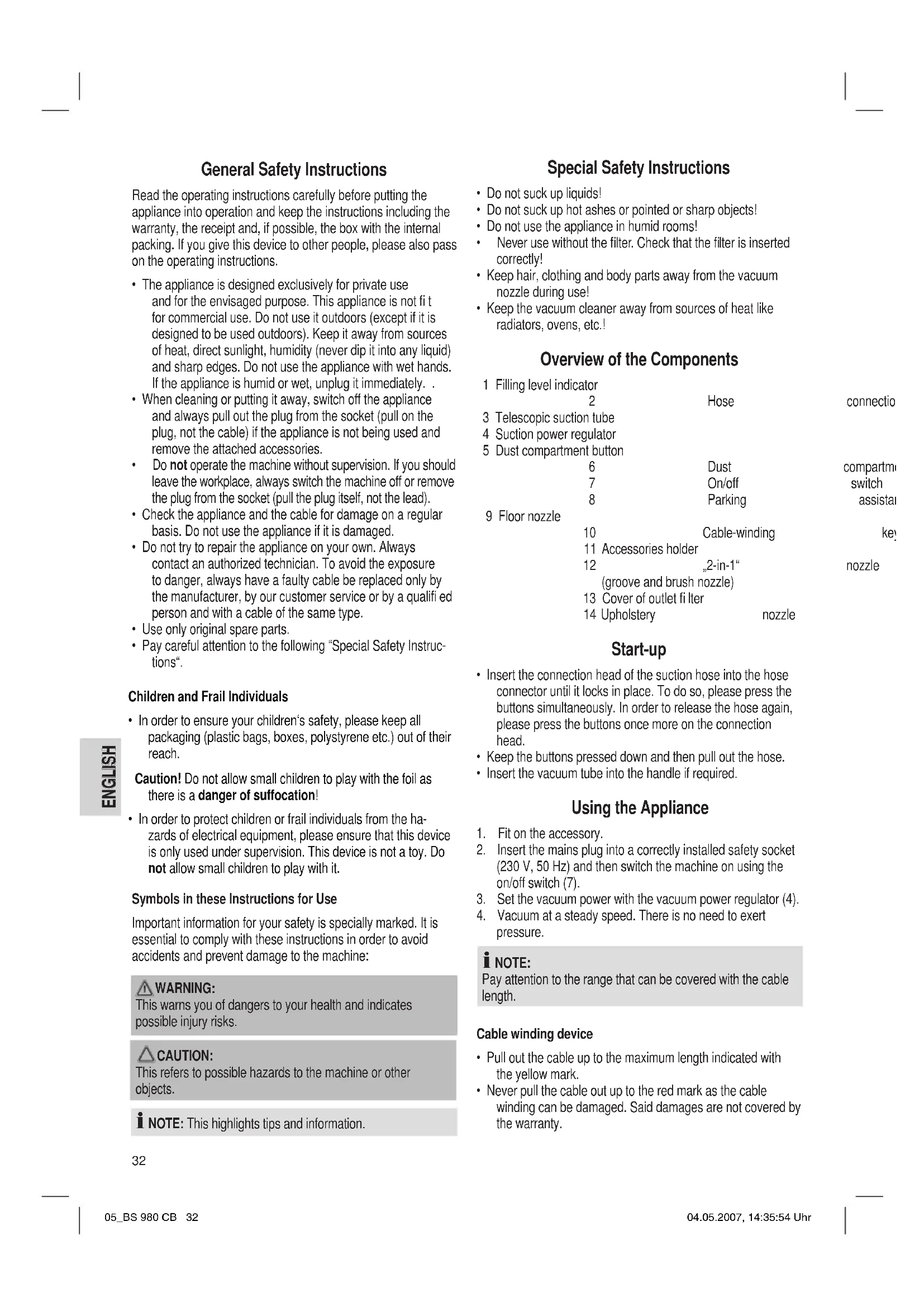 - If the suction power suddenly diminishes during operation this may be due to the fi lters being locked. 05_BS 980 CB 34 04.05.2007, 14:35:57 UhrENGLISH ENGLISH ENGLISH