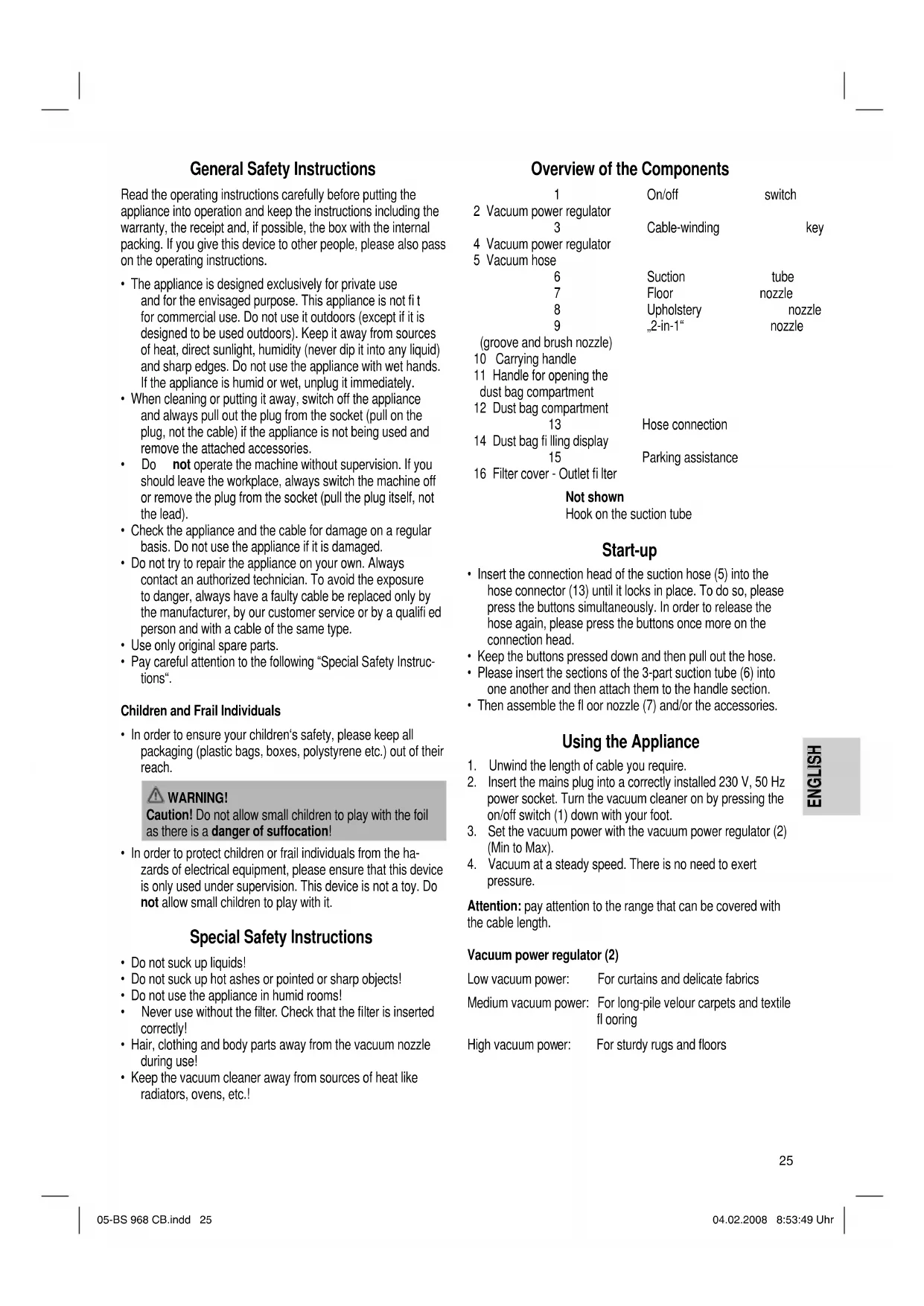 pressure. Attention: pay attention to the range that can be covered with the cable length. Vacuum power regulator (2) Low vacuum power: For curtains and delicate fabrics Medium vacuum power: For long-pile velour carpets and textile fl ooring High vacuum power: For sturdy rugs and fl oors 05-BS 968 CB.indd 2505-BS 968 CB.indd 25 04.02.2008 8:53:49 Uhr04.02.2008 8:53:49 UhrENGLISH ENGLISH