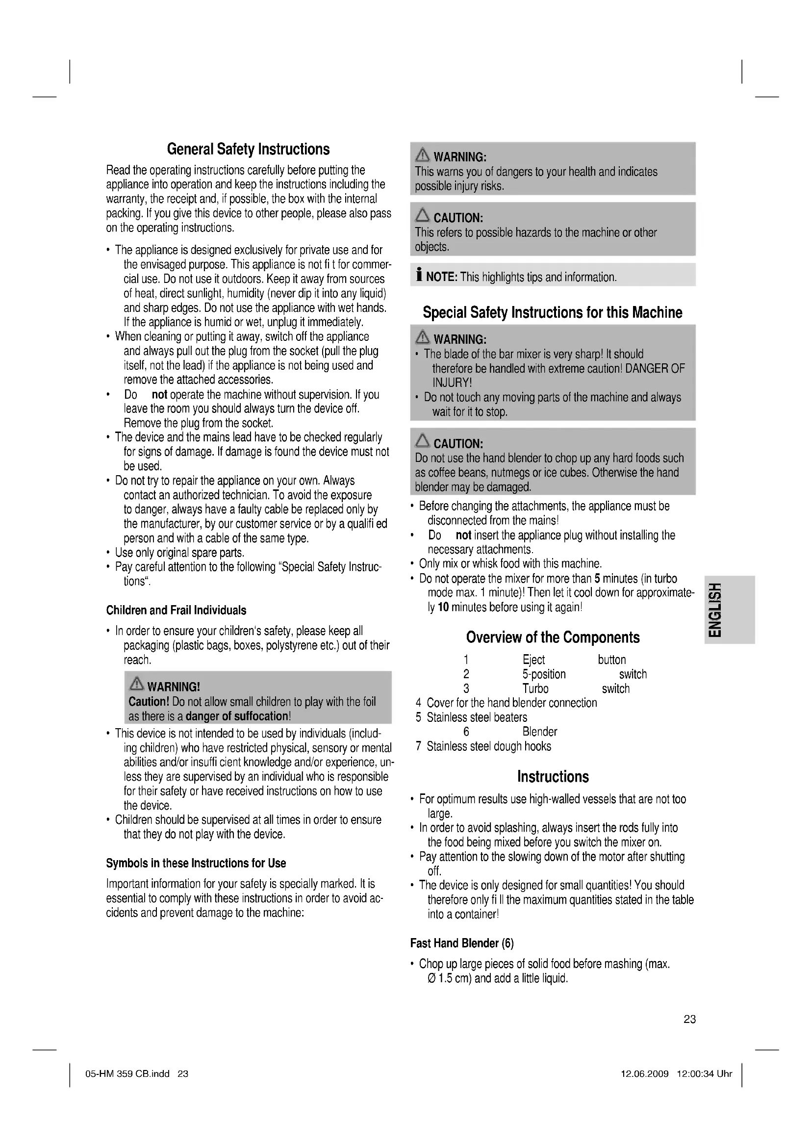 - Do not operate the mixer for more than 5 minutes (in turbo mode max. 1 minute)! Then let it cool down for approximate- ly 10 minutes before using it again! Overview of the Components 1 Eject button 2 5-position switch 3 Turbo switch 4 Cover for the hand blender connection 5 Stainless steel beaters 6 Blender 7 Stainless steel dough hooks Instructions