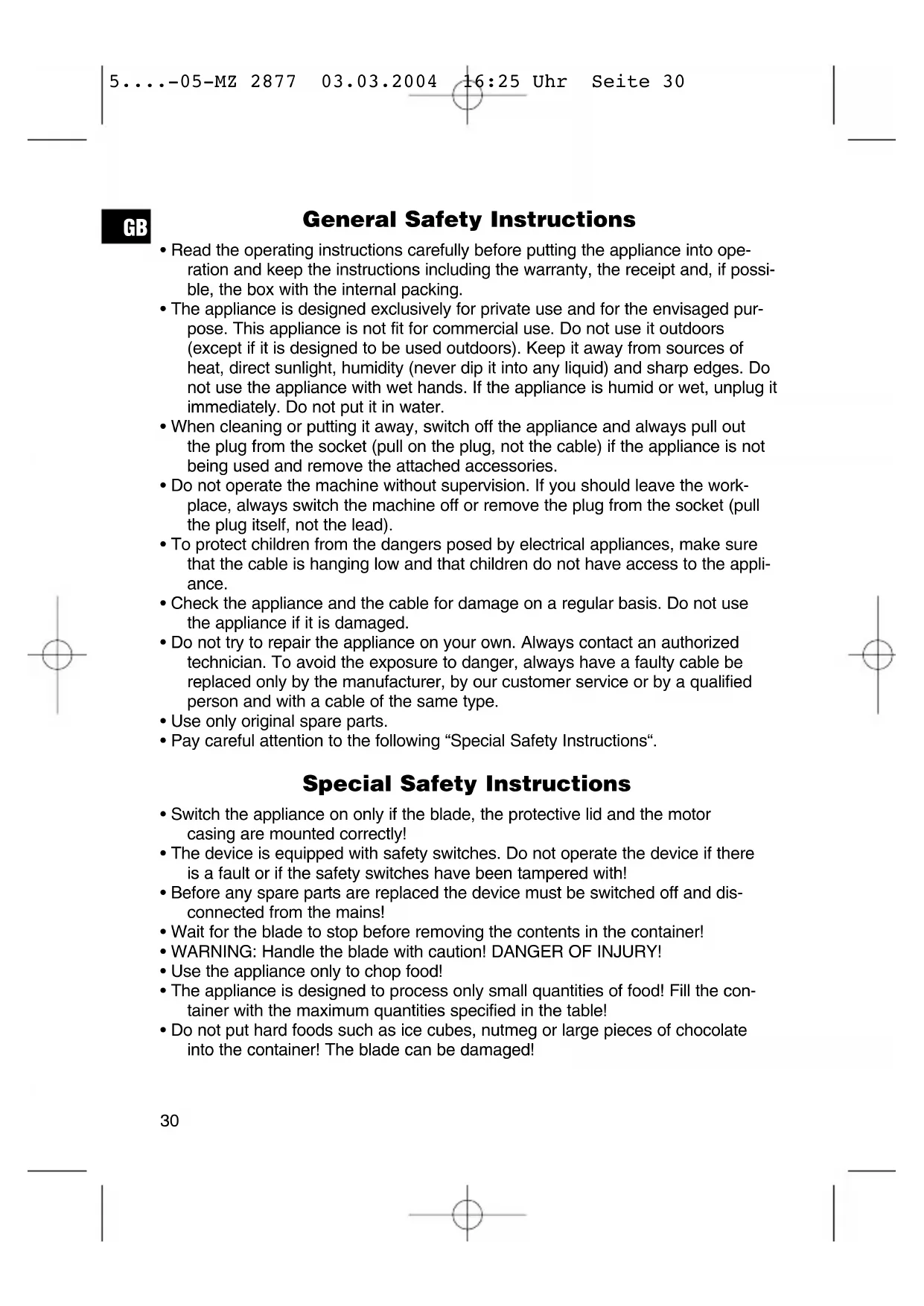 5....-05-MZ 2877 03.03.2004 16:25 Uhr Seite 32Defects to consumables or parts subject to wearing (e.g. motor pistons, kneading blades, drive shafts, spare remote control, spare toothbrushes, saw blades, etc.) as well as cleaning, maintenance or the replacement of said parts are not covered by the guarantee and hence are to be paid! The guarantee lapses in case of unauthorized tampering. After the expiry of the guarantee After the expiry of the guarantee repairs can be carried by the competent dealer or repair service against the payment of the ensuing costs.