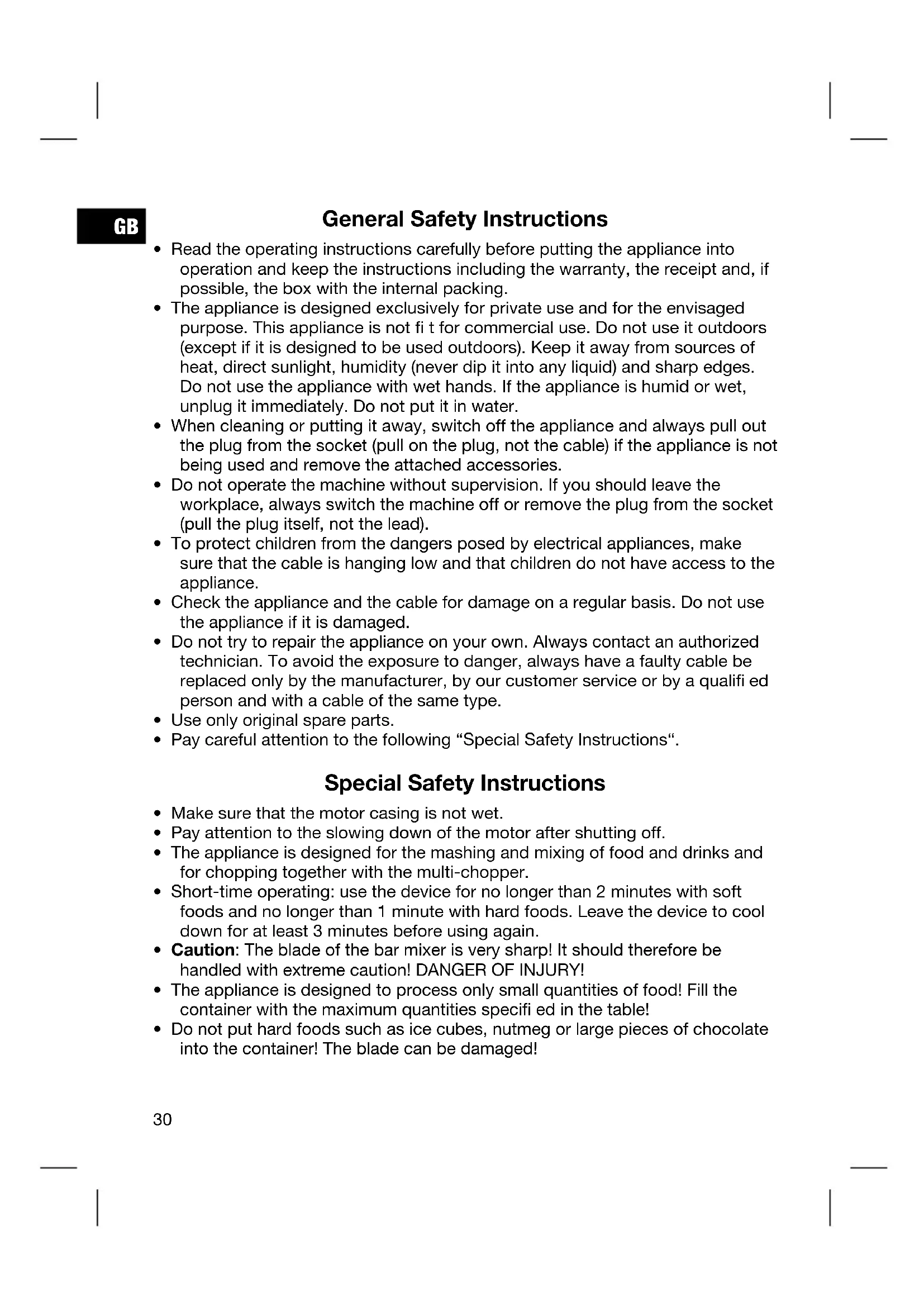 - Do not put hard foods such as ice cubes, nutmeg or large pieces of chocolate into the container! The blade can be damaged!GB