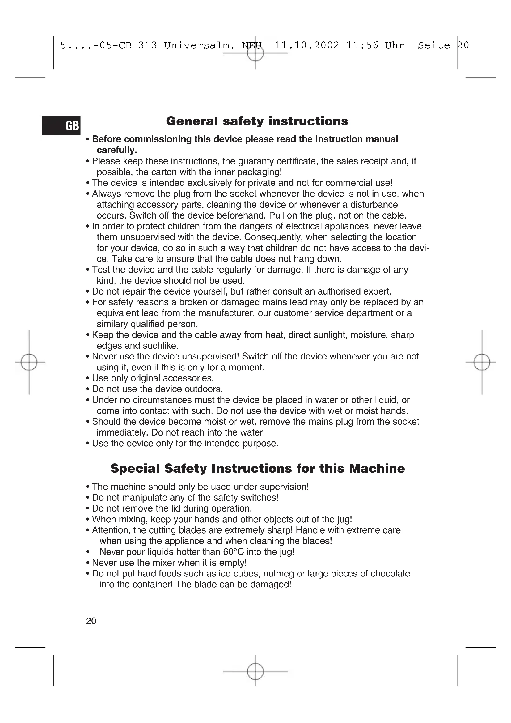5....-05-CB 313 Universalm. NEU 11.10.2002 11:56 Uhr Seite 21Should the warranty be valid, please consign the complete appliance in its original packing together with the cash receipt to your local dealer. You are not entitled to the replacement of the appliance owing to broken glass parts and faulty accessories. However, said parts will be replaced free of charge. In this case only the faulty accessory needs to be ordered without sending back the whole appliance! The cleaning, servicing and replacement of wear parts are not covered by this war- ranty and hence are to be paid for. The warranty is terminated in case of handling on the part of Third parties. After the warranty Once the warranty has expired, repairs can be carried out by specialized technici- ans or repair services against the payment of the service.