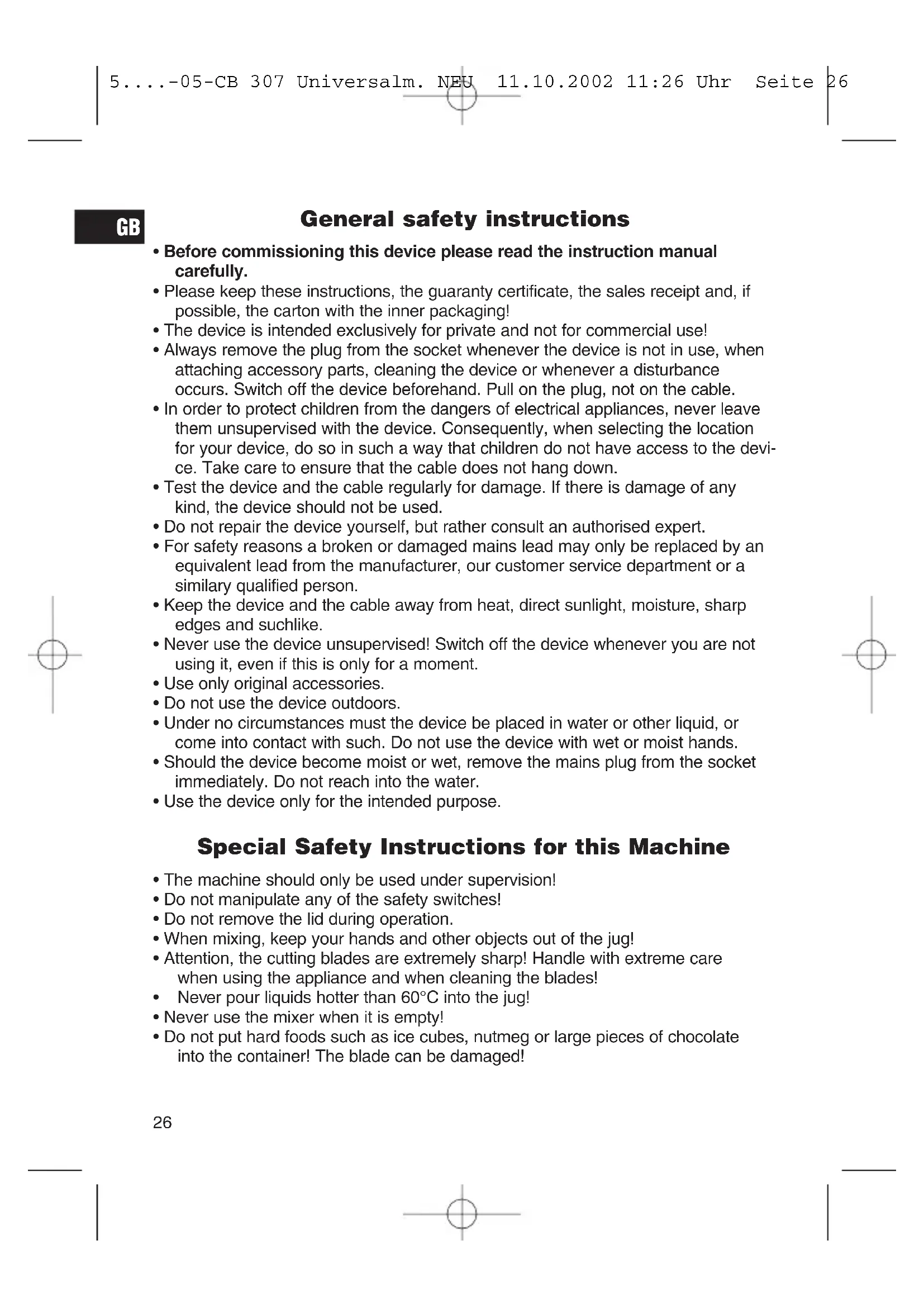All the parts of the decanter can be washed in the uppermost rack of the dishwas- her. After cleaning and drying the decanter must be reassembled so that the gasket is located between the blade block and the decanter. See „Overview of Components“. Before using each time the blade block must be screwed securely onto the decan- ter. Dry the external surface of the mixer base with a moist cloth. 5....-05-CB 307 Universalm. NEU 11.10.2002 11:26 Uhr Seite 27Important notice on the safety switch The all-purpose mixer is equipped with a safety switch that avoids that the motor run without the decanter mounted on it (danger of injury!). When the decanter is mounted, the safety pin on the transparent cover disc pres- ses against the safety switch of the motor casing. The all-purpose mixer can now be switched on. If the safety pin does not press correctly against safety switch, the motor does not run. For example, this is the case when the position of the transpa- rent cover ring is changed when cleaning. Make sure that the safety pin is in the right position. For right-handed users the safety pin must be located below the handle. For left-handed users the safety pin must be located below the pour spout. This appliance conforms with the CE directives for radio interference suppression and low-voltage safety and has been built to meet current safety requirements. Subject to technical changes without prior notice! Guarantee We undertake to guarantee the appliance sold by our company for 24 months as of the date of purchase (cash receipt). During the life of the warranty we shall provide for the repair or replacement of the appliance owing to material or manufacturing defects absolutely free of charge. Proof for the warranty is provided by the purchase document. The replacement and repair will not be performed free of charge without this proof of purchase. Should the warranty be valid, please consign the complete appliance in its original packing together with the cash receipt to your local dealer. You are not entitled to the replacement of the appliance owing to broken glass parts and faulty accessories. However, said parts will be replaced free of charge. In this case only the faulty accessory needs to be ordered without sending back the whole appliance! The cleaning, servicing and replacement of wear parts are not covered by this war- ranty and hence are to be paid for. The warranty is terminated in case of handling on the part of Third parties. After the warranty Once the warranty has expired, repairs can be carried out by specialized technici- ans or repair services against the payment of the service.