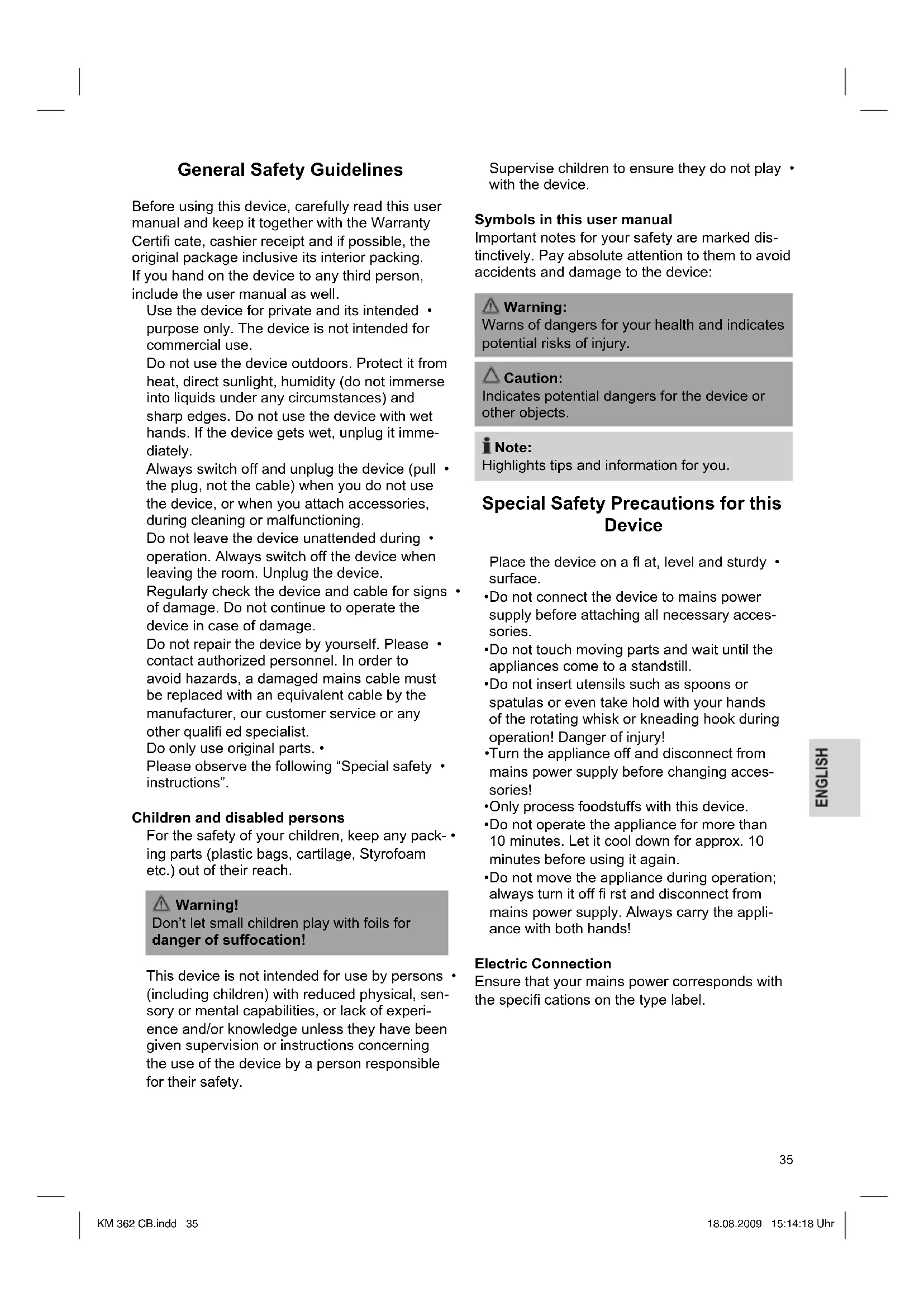 Технічні характеристики Модель: ..............................................KM 362 CB Номінальна напруга/частота: ........230 В/ 50 Гц Споживання живлення:..........................1000 Вт Клас захисту: ....................................................II Короткотермінова робота: ................. 10 хвилин Вага нетто: ................................................5,65 кг Технічні характеристики можуть бути змінені! Цей пристрій сертифіковано відповідно до діючих норм РЄ, наприклад норм електромагнітної сумісності і низької напруги, і сконструйовано відповідно до останніх характеристик із техніки безпеки. KM 362 CB.indd 34KM 362 CB.indd 34 18.08.2009 15:14:17 Uhr18.08.2009 15:14:17 Uhr35 General Safety Guidelines Before using this device, carefully read this user manual and keep it together with the Warranty Certifi cate, cashier receipt and if possible, the original package inclusive its interior packing. If you hand on the device to any third person, include the user manual as well. Use the device for private and its intended • purpose only. The device is not intended for commercial use. Do not use the device outdoors. Protect it from heat, direct sunlight, humidity (do not immerse into liquids under any circumstances) and sharp edges. Do not use the device with wet hands. If the device gets wet, unplug it imme- diately. Always switch off and unplug the device (pull • the plug, not the cable) when you do not use the device, or when you attach accessories, during cleaning or malfunctioning. Do not leave the device unattended during • operation. Always switch off the device when leaving the room. Unplug the device. Regularly check the device and cable for signs • of damage. Do not continue to operate the device in case of damage. Do not repair the device by yourself. Please • contact authorized personnel. In order to avoid hazards, a damaged mains cable must be replaced with an equivalent cable by the manufacturer, our customer service or any other qualifi ed specialist. Do only use original parts. • Please observe the following “Special safety • instructions”. Children and disabled persons For the safety of your children, keep any pack- • ing parts (plastic bags, cartilage, Styrofoam etc.) out of their reach. Warning! Don’t let small children play with foils for danger of suffocation! This device is not intended for use by persons • (including children) with reduced physical, sen- sory or mental capabilities, or lack of experi- ence and/or knowledge unless they have been given supervision or instructions concerning the use of the device by a person responsible for their safety. Supervise children to ensure they do not play • with the device. Symbols in this user manual Important notes for your safety are marked dis- tinctively. Pay absolute attention to them to avoid accidents and damage to the device: