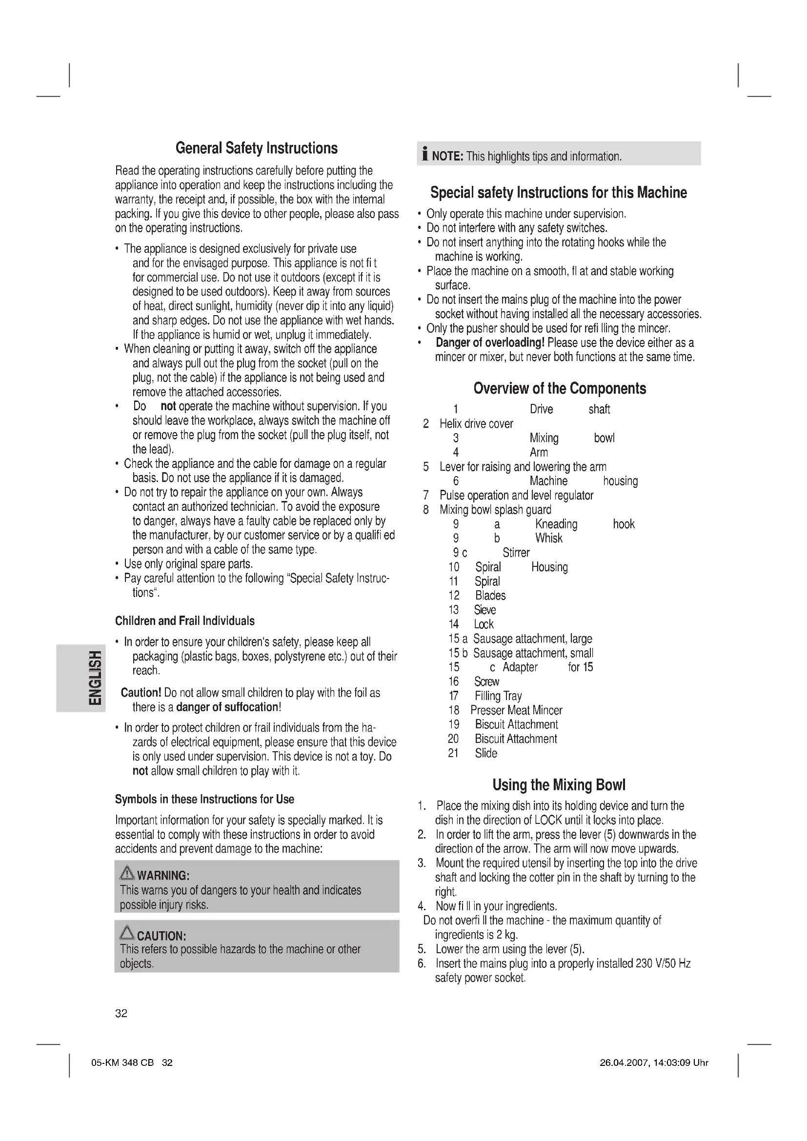 - Danger of overloading! Please use the device either as a mincer or mixer, but never both functions at the same time. Overview of the Components 1 Drive shaft 2 Helix drive cover 3 Mixing bowl 4 Arm 5 Lever for raising and lowering the arm 6 Machine housing 7 Pulse operation and level regulator 8 Mixing bowl splash guard 9 a Kneading hook 9 b Whisk 9 c Stirrer 10 Spiral Housing 11 Spiral 12 Blades 13 Sieve 14 Lock 15 a Sausage attachment, large 15 b Sausage attachment, small 15 c Adapter for 15 16 Screw 17 Filling Tray 18 Presser Meat Mincer 19 Biscuit Attachment 20 Biscuit Attachment 21 Slide Using the Mixing Bowl