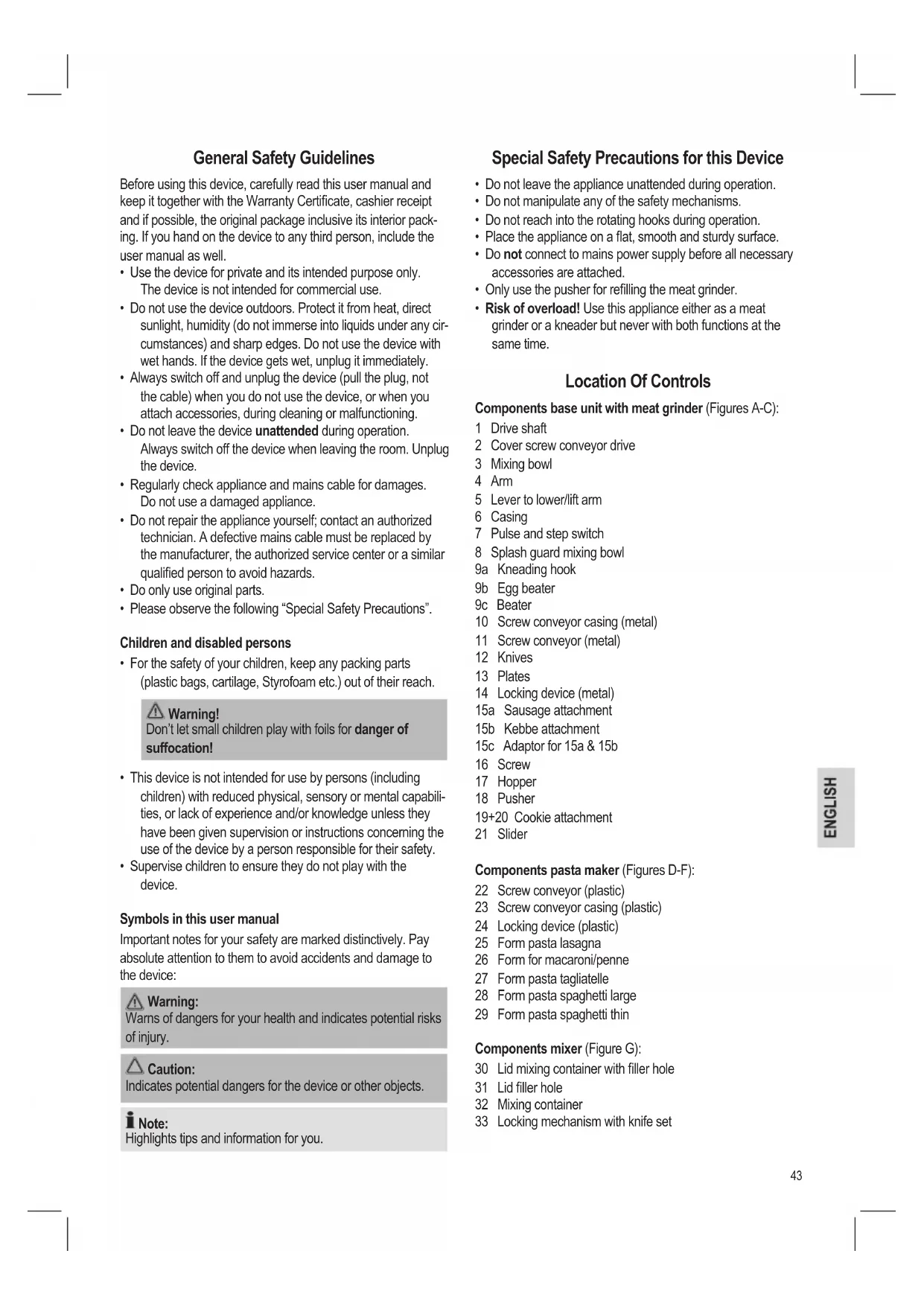 - Risk of overload! Use this appliance either as a meat grinder or a kneader but never with both functions at the same time. Location Of Controls Components base unit with meat grinder (Figures A-C): 1 Drive shaft 2 Cover screw conveyor drive 3 Mixing bowl 4 Arm 5 Lever to lower/lift arm 6 Casing 7 Pulse and step switch 8 Splash guard mixing bowl 9a Kneading hook 9b Egg beater 9c Beater 10 Screw conveyor casing (metal) 11 Screw conveyor (metal) 12 Knives 13 Plates 14 Locking device (metal) 15a Sausage attachment 15b Kebbe attachment 15c Adaptor for 15a & 15b 16 Screw 17 Hopper 18 Pusher 19+20 Cookie attachment 21 Slider Components pasta maker (Figures D-F): 22 Screw conveyor (plastic) 23 Screw conveyor casing (plastic) 24 Locking device (plastic) 25 Form pasta lasagna 26 Form for macaroni/penne 27 Form pasta tagliatelle 28 Form pasta spaghetti large 29 Form pasta spaghetti thin Components mixer (Figure G): 30 Lid mixing container with ller hole 31 Lid ller hole 32 Mixing container 33 Locking mechanism with knife set44 Scope Of Delivery 1 X Kneader/mixer base unit 1 X Mixing bowl 1 X Splash guard with hopper 1 X Kneading hook 1 X Egg beater 1 X Beater 1 X Screw conveyor casing 1 X Screw conveyor 1 X Knife 3 X Plates 1 X Locking device 1 X Sausage attachment 1 X Kebbe attachment 1 X Adaptor for sausage/ kebbe attachment 1 X Screw 1 X Hopper 1 X Pusher 1 X Cookie attachment 3-piece 1 X Screw conveyor (plastic) 1 X Screw conveyor casing (plastic) 1 X Locking device (plastic) 1 X Form pasta lasagna 1 X Form for macaroni/penne 1 X Form pasta tagliatelle 1 X Form pasta spaghetti large 1 X Form pasta spaghetti thin 1 X Lid ller hole 1 X Lid mixing container with ller hole 1 X Mixing container No illustration 1 X Storage box 1 X Tool for locking mechanism pasta maker Use Instruction Mixing Bowl