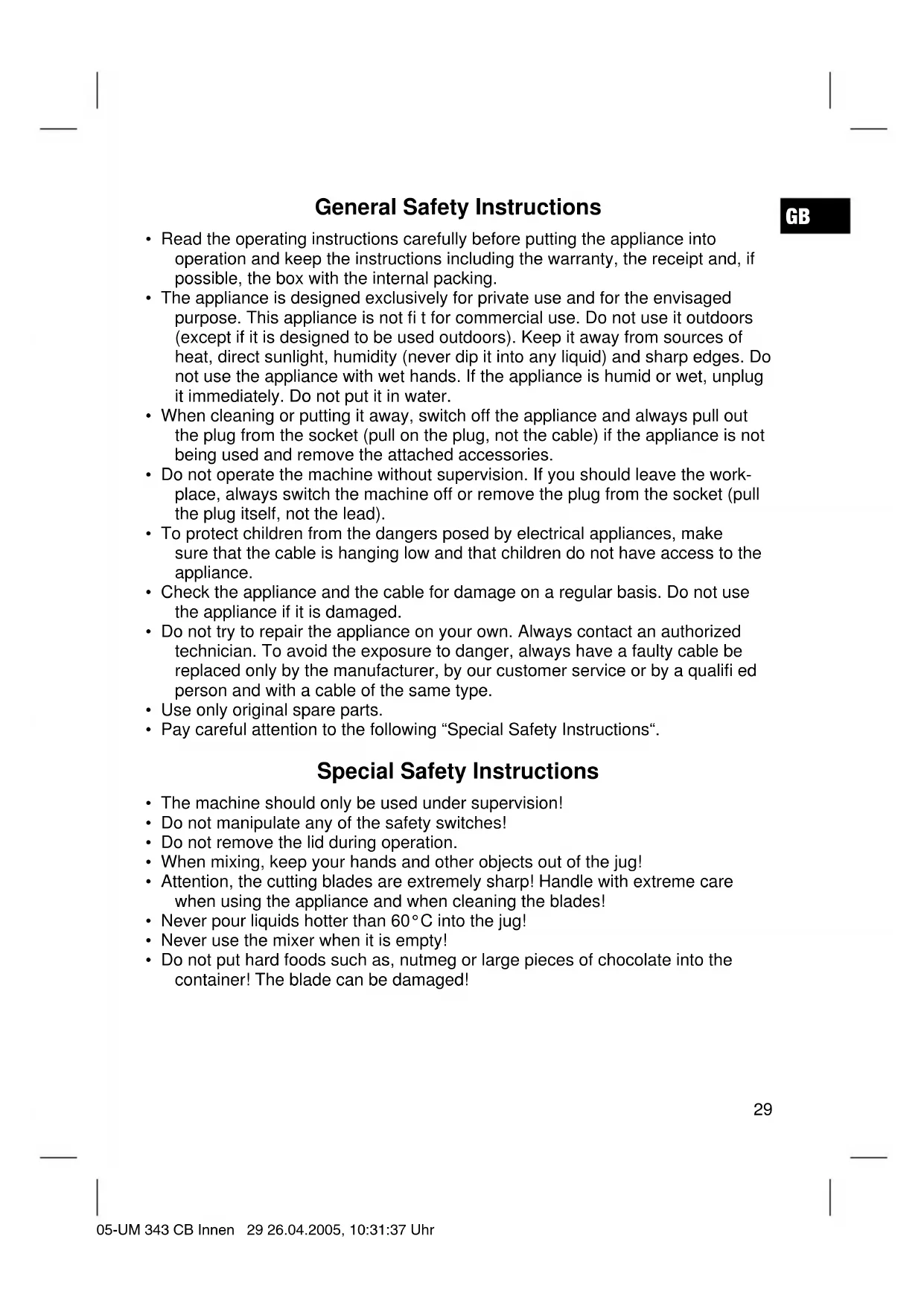 - Do not put hard foods such as, nutmeg or large pieces of chocolate into the container! The blade can be damaged! 05-UM 343 CB Innen 29 26.04.2005, 10:31:37 UhrGB
