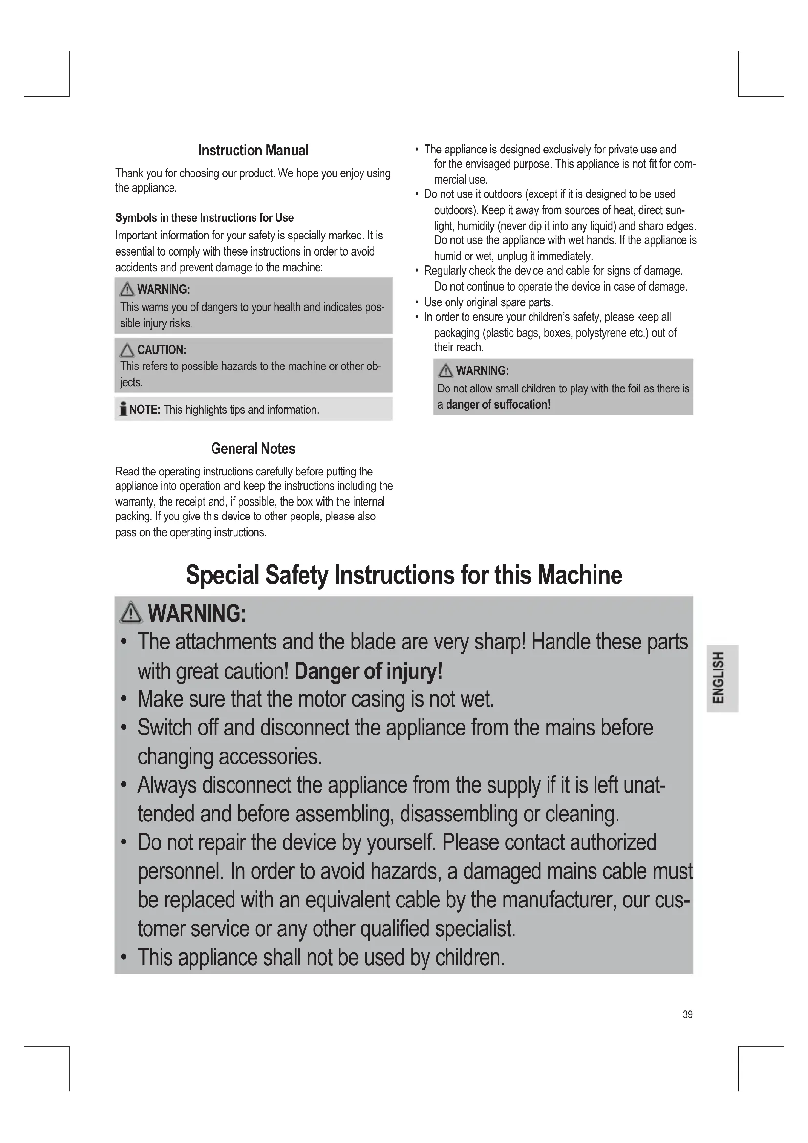 This warns you of dangers to your health and indicates pos- sible injury risks. CAUTION: This refers to possible hazards to the machine or other ob- jects. NOTE: This highlights tips and information. General Notes Read the operating instructions carefully before putting the appliance into operation and keep the instructions including the warranty, the receipt and, if possible, the box with the internal packing. If you give this device to other people, please also pass on the operating instructions. Special Safety Instructions for this Machine