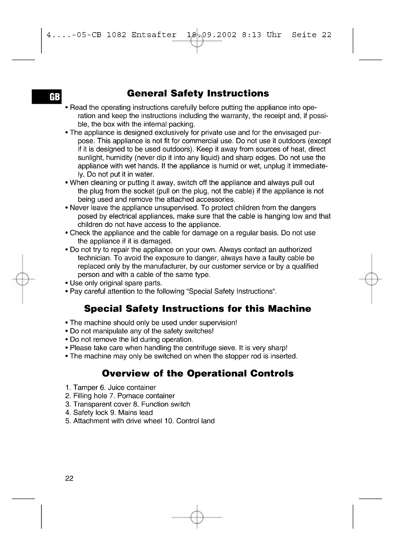 4....-05-CB 1082 Entsafter 18.09.2002 8:13 Uhr Seite 23If you wish to make a claim under the guarantee please return the entire machine in the original packaging to your dealer together with the receipt. *) Damage to accessories does not mean automatic free replacement of the whole machine. In such cases please contact our hotline. Broken glass or breakage of plastic parts are always subject to a charge. Defects to consumables or parts subject to wearing (e.g. motor pistons, kneading blades, drive shafts, spare remote control, spare toothbrushes, saw blades, etc.) as well as cleaning, maintenance or the replacement of said parts are not covered by the guarantee and hence are to be paid! The guarantee lapses in case of unauthorized tampering. After the expiry of the guarantee After the expiry of the guarantee repairs can be carried by the competent dealer or repair service against the payment of the ensuing costs.