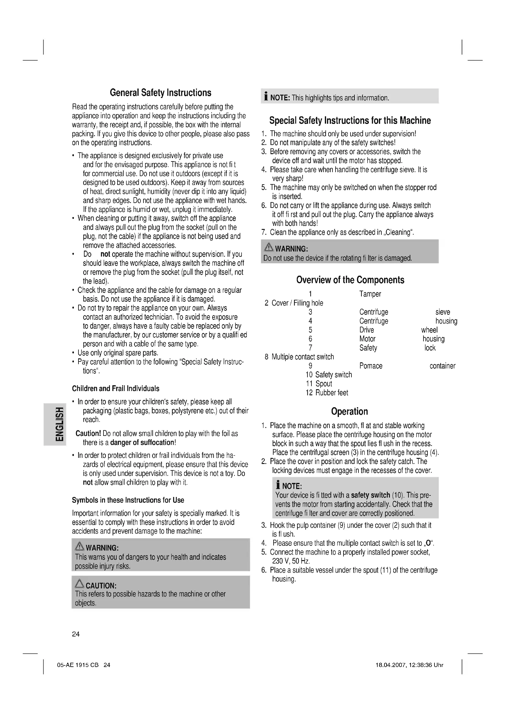 - Device is not working Remedy: Check the mains connection. Check the position of the switch. Other possible causes: The device is fi tted with a safety switch (10). This prevents the motor from starting up unintentionally. Remedy: Check that the centrifuge fi lter and cover are correctly positioned. Technical Data Model:......................................................................... AE 1915 CB Power supply:................................................220-240 V, 50/60 Hz Power consumption:.....................................................500-700 W Protection class:.......................................................................... ΙΙ Short-term operation:...........................................................3 Min. This device has been tested according to all relevant current CE guidelines, such as electromagnetic compatibility and low voltage directives, and has been constructed in accordance with the latest safety regulations. Subject to technical changes without prior notice! Guarantee The device supplied by our Company is covered by a 24 month guarantee starting on the date of purchase (receipt). During the life of the guarantee any fault of the device or its accessories ascribable to material or manufacturing defects will be eliminated free of charge by repairing or, at our discretion, by replacing it. The guarantee services do not entail an extension of the life of the guarantee nor do they give rise to any right to a new guarantee! Proof of the guarantee is provided by the proof of purchase. Without proof of purchase no free replacement or repair will be carried out. If you wish to make a claim under the guarantee please return the entire machine in the original packaging to your dealer together with the receipt. Defects to consumables or parts subject to wearing as well as cleaning, maintenance or the replacement of said parts are not covered by the guarantee and hence are to be paid! The guarantee lapses in case of unauthorized tampering. 05-AE 1915 CB 25 18.04.2007, 12:38:38 UhrENGLISH ENGLISH