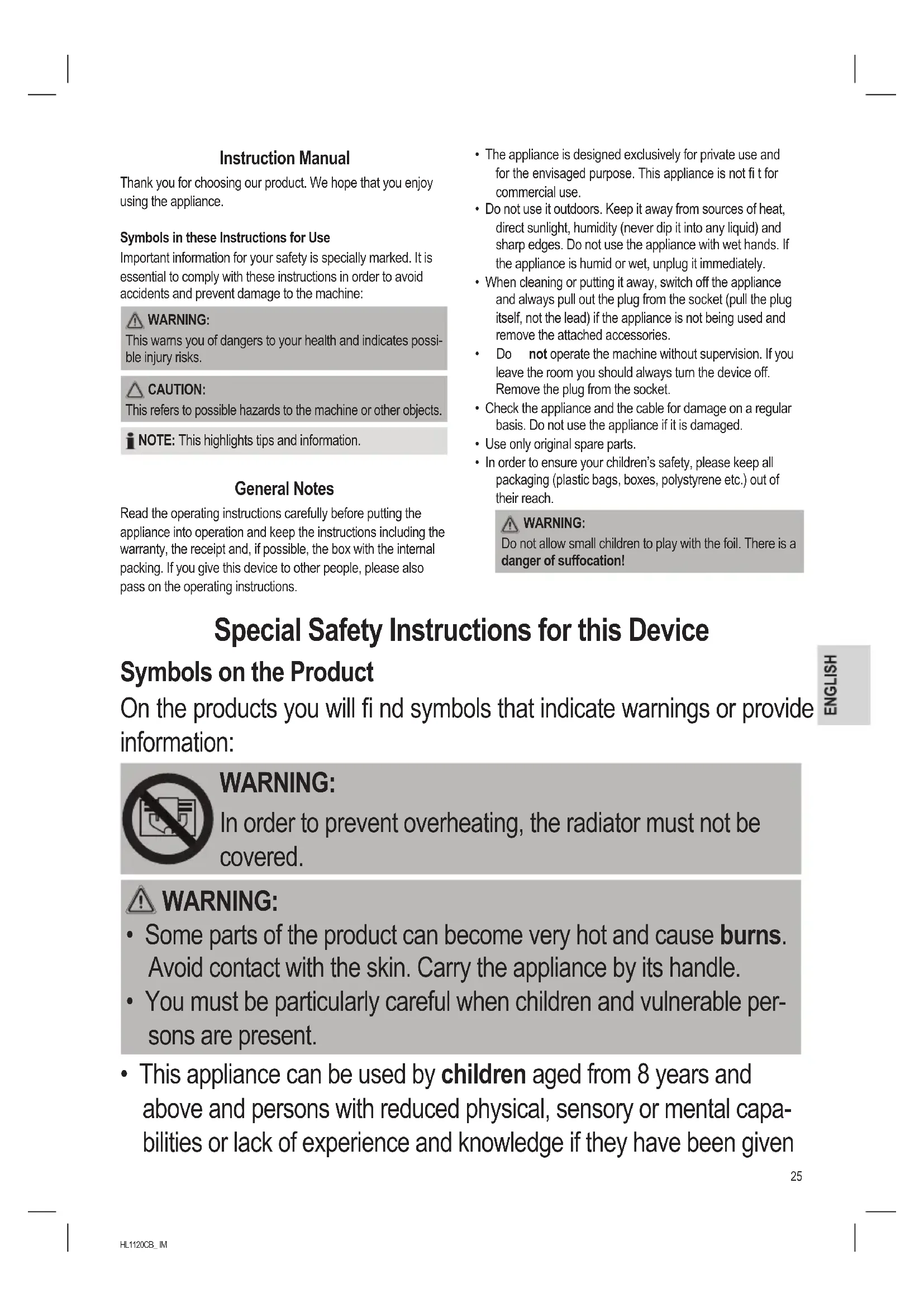 - This appliance can be used by children aged from 8 years and above and persons with reduced physical, sensory or mental capa- bilities or lack of experience and knowledge if they have been given26 HL1120CB_ IM 07.04.16 supervision or instruction concerning use of the appliance in a safe way and understand the hazards involved.