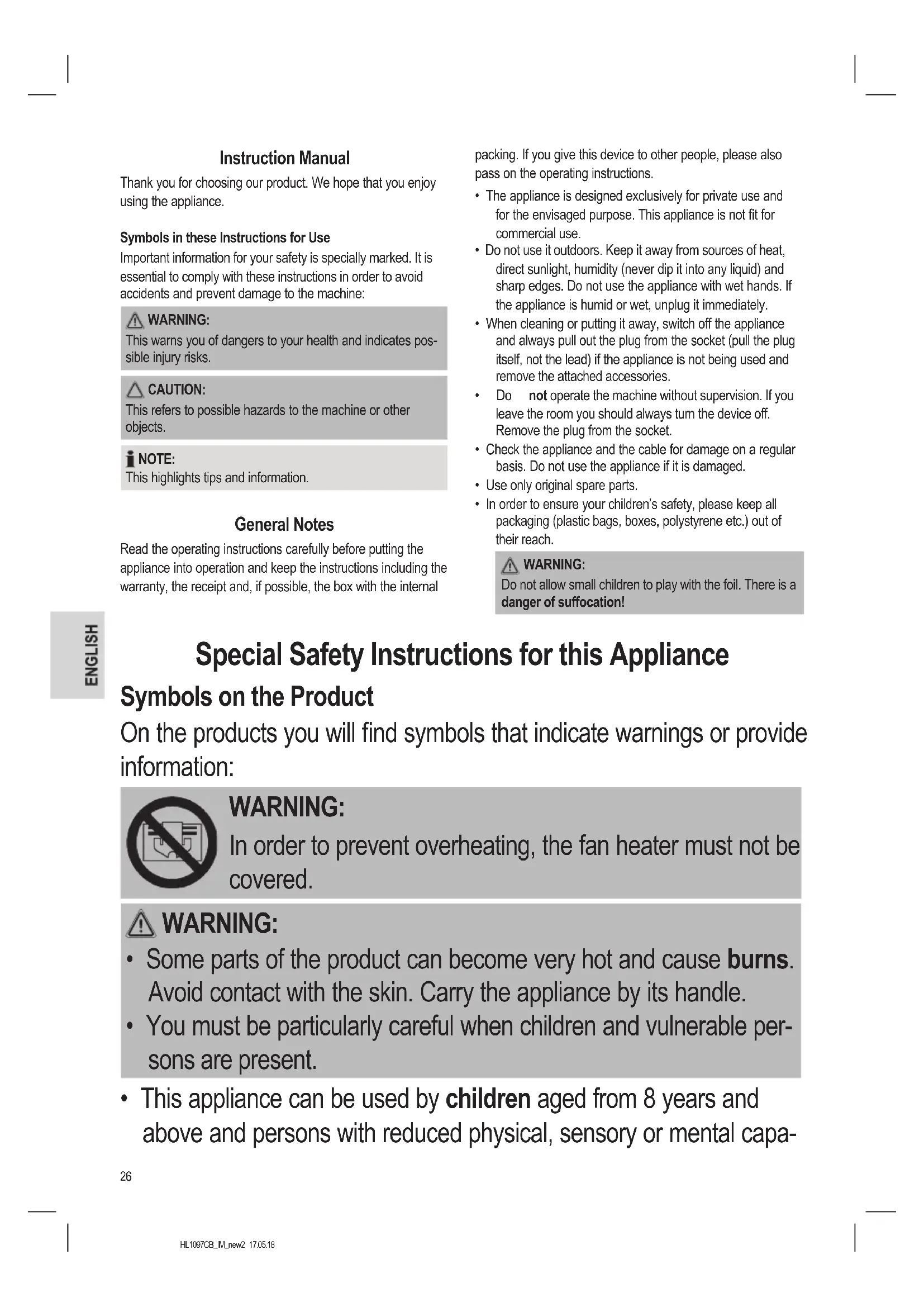 - This appliance can be used by children aged from 8 years and above and persons with reduced physical, sensory or mental capa-27 HL1097CB_IM_new2 17.05.18 bilities or lack of experience and knowledge if they have been given supervision or instruction concerning use of the appliance in a safe way and understand the hazards involved.