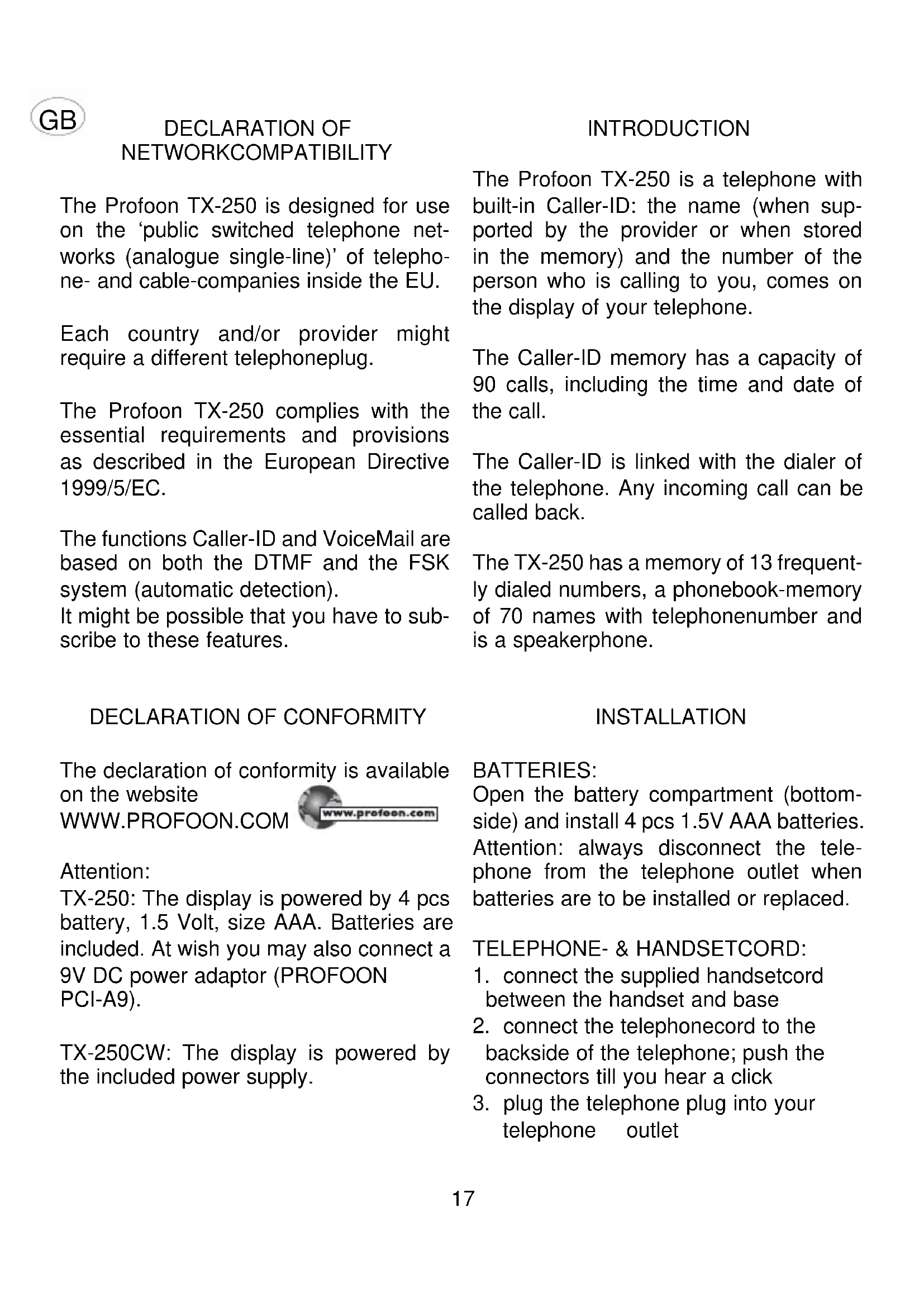 TX250CW - Desk Phone PROFOON - Free user manual and instructions