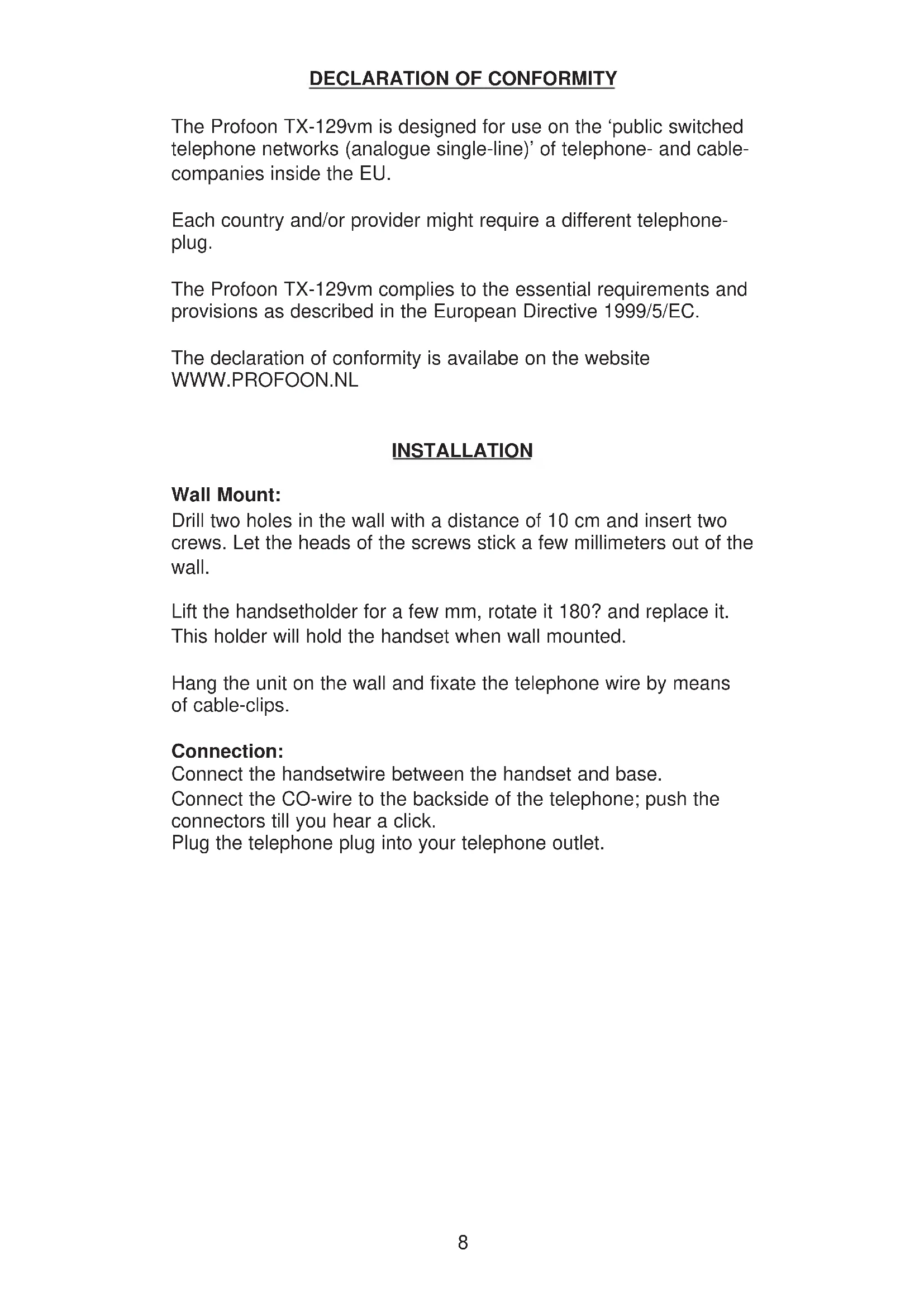 The Profoon TX-129vm is designed for use on the ‘public switched telephone networks (analogue single-line)’ of telephone- and cable-companies inside the EU.