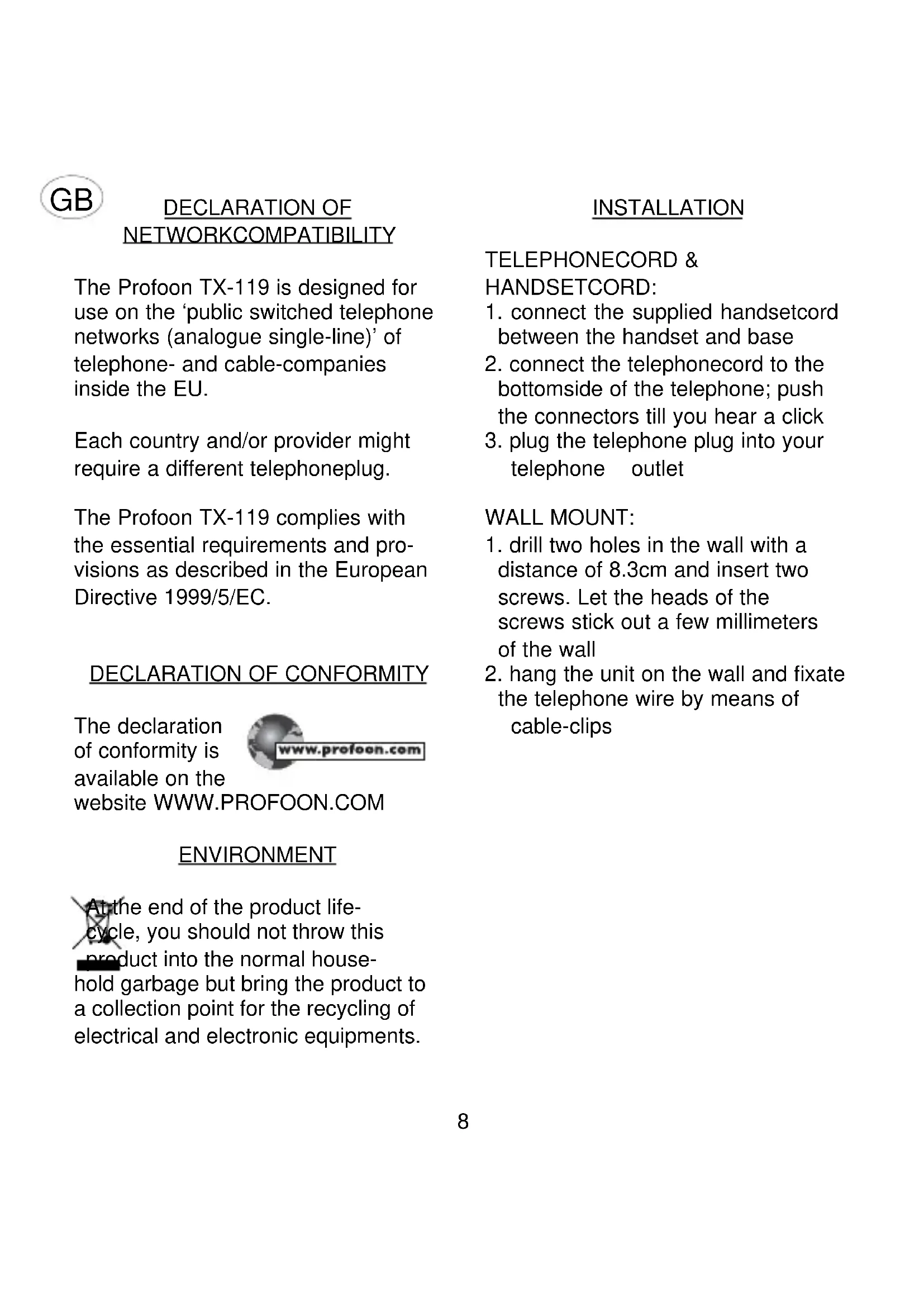 The Profoon TX-119 is designed for use on the 'public switched telephone networks (analogue single-line)' of telephone- and cable-companies inside the EU.