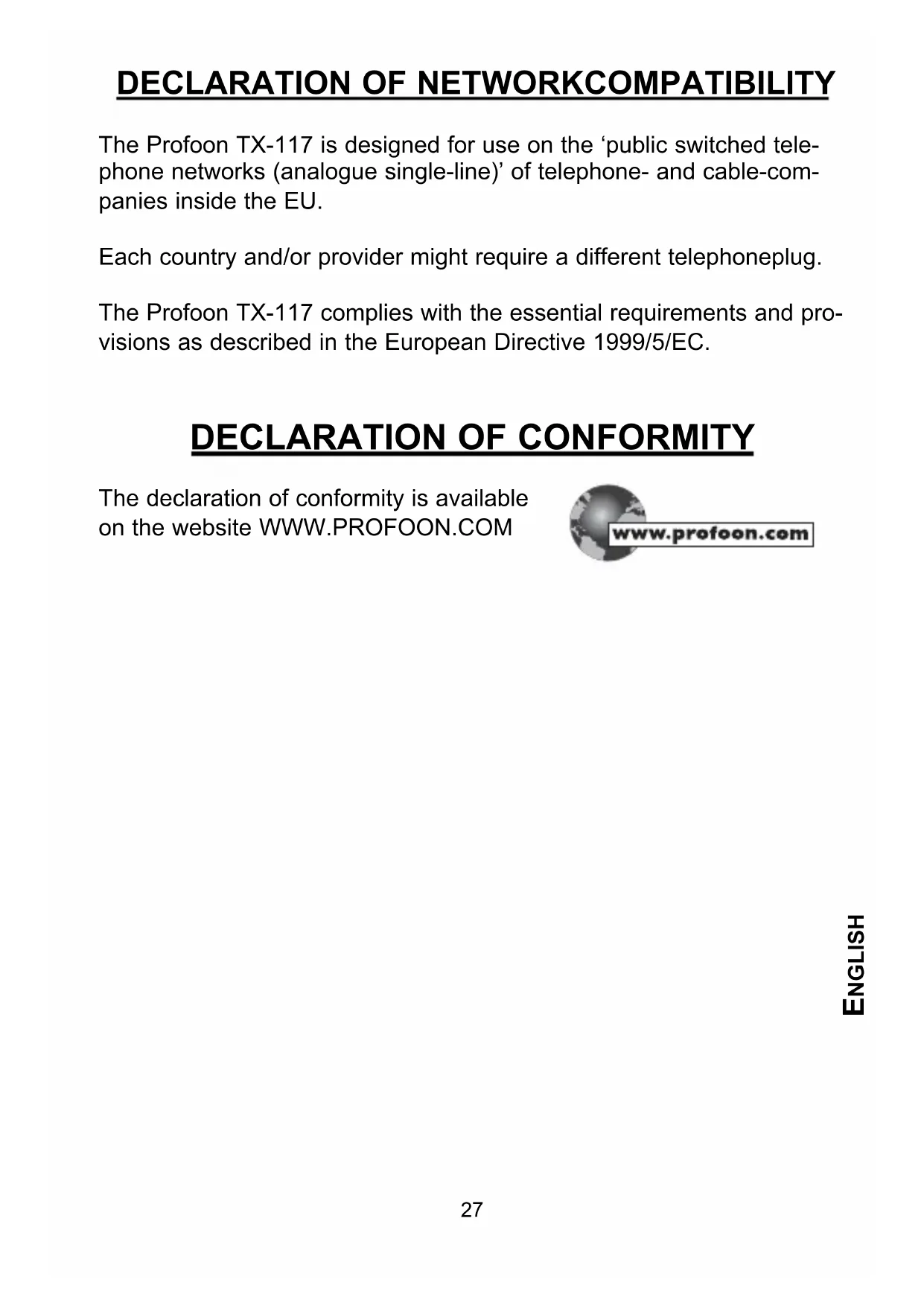The Profoon TX-117 is designed for use on the ‘public switched tele- phone networks (analogue single-line)’ of telephone- and cable-com- panies inside the EU. Each country and/or provider might require a different telephoneplug. The Profoon TX-117 complies with the essential requirements and pro- visions as described in the European Directive 1999/5/EC.