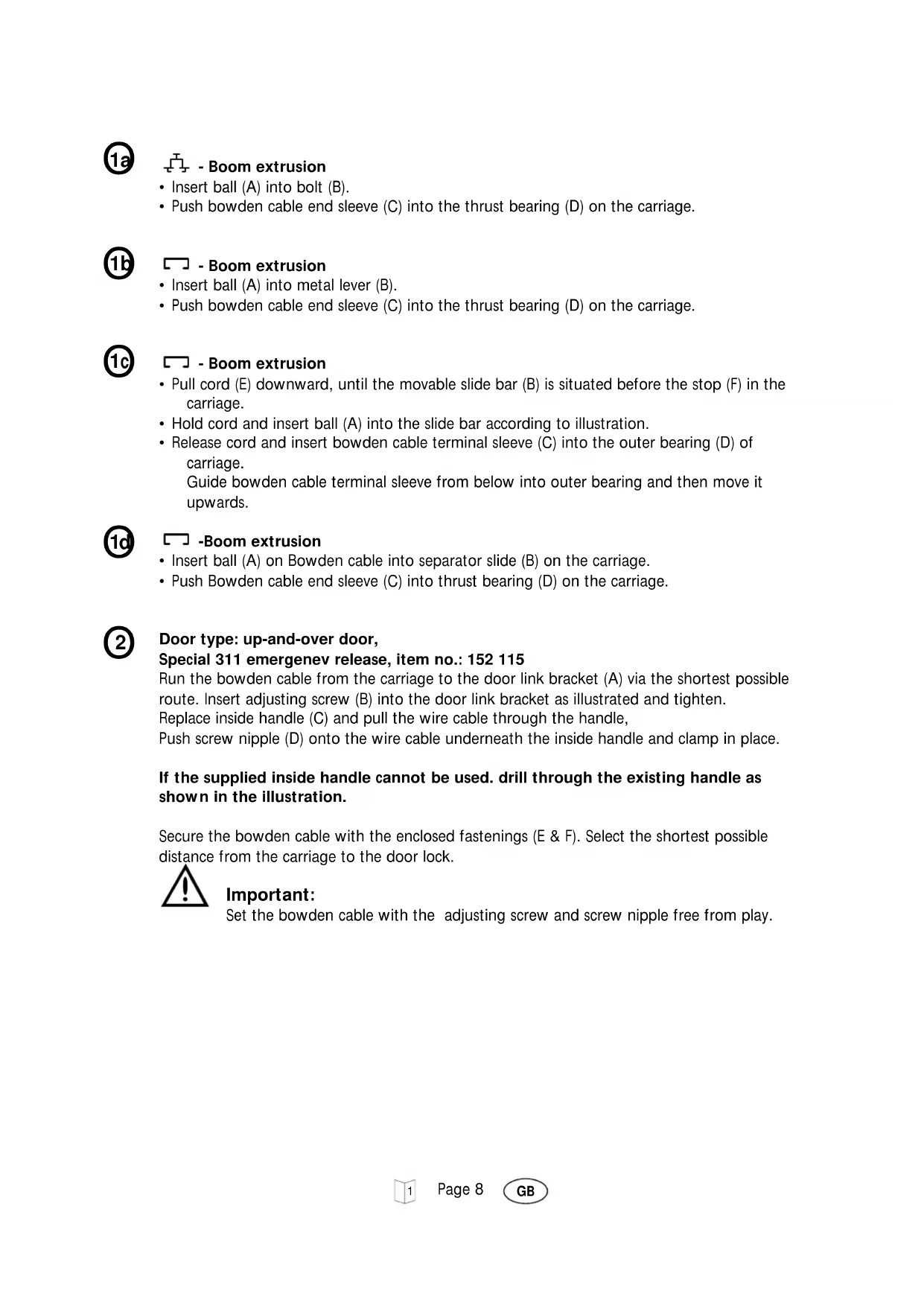 - Push Bowden cable end sleeve (C) into thrust bearing (D) on the carriage. Door type: up-and-over door, Special 311 emergenev release, item no.: 152 115 Run the bowden cable from the carriage to the door link bracket (A) via the shortest possible route. Insert adjusting screw (B) into the door link bracket as illustrated and tighten. Replace inside handle (C) and pull the wire cable through the handle, Push screw nipple (D) onto the wire cable underneath the inside handle and clamp in place. If the supplied inside handle cannot be used. drill through the existing handle as shown in the illustration. Secure the bowden cable with the enclosed fastenings (E & F). Select the shortest possible distance from the carriage to the door lock. Important: Set the bowden cable with the adjusting screw and screw nipple free from play.