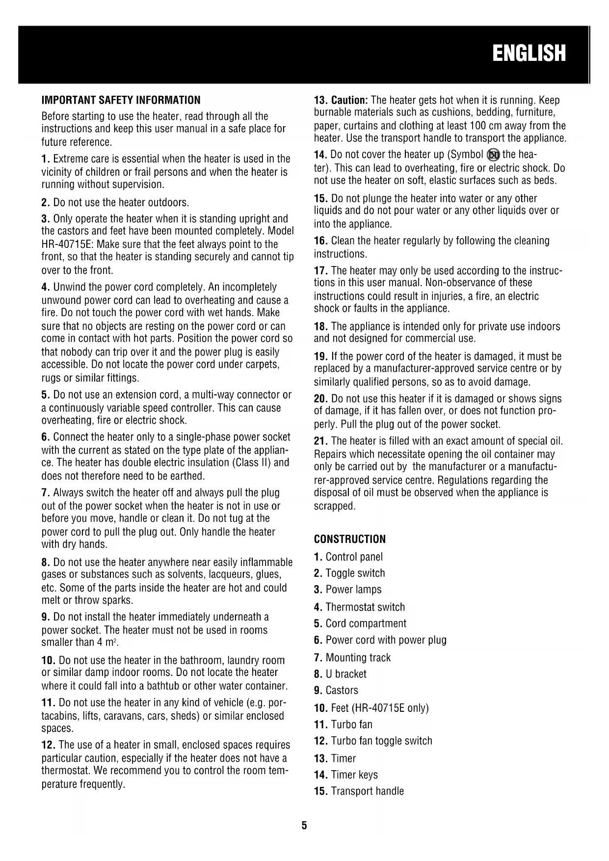 15. Do not plunge the heater into water or any other