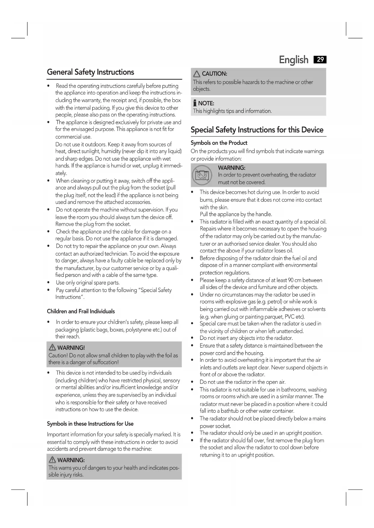 - Thisradiatorislledwithanexactquantityofaspecialoil. Repairs where it becomes necessary to open the housing of the radiator may only be carried out by the manufac- turer or an authorised service dealer. You should also contact the above if your radiator loses oil.