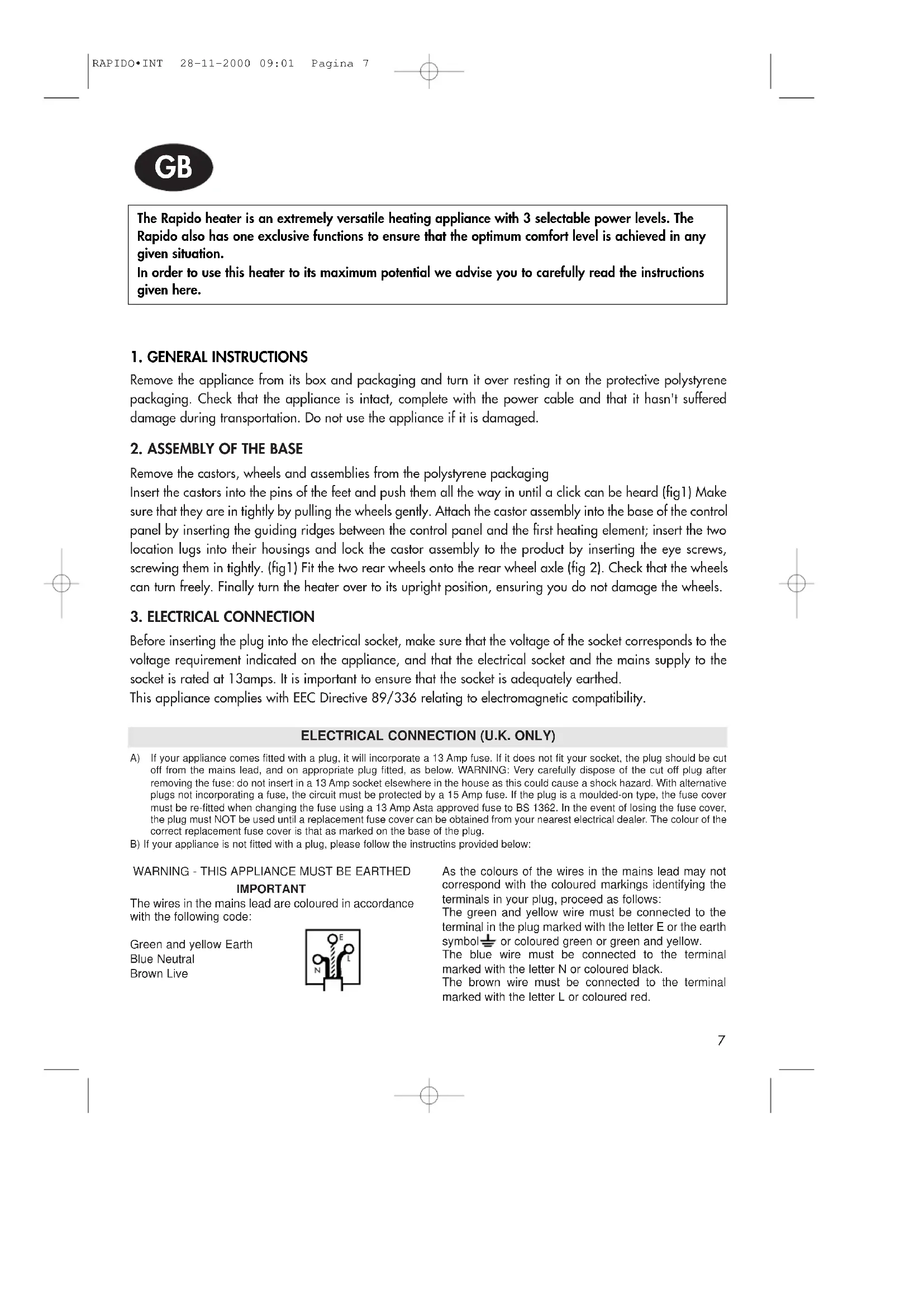 The Rapido heater is an extremely versatile heating appliance with 3 selectable power levels. The Rapido also has one exclusive functions to ensure that the optimum comfort level is achieved in any given situation. In order to use this heater to its maximum potential we advise you to carefully read the instructions given here.