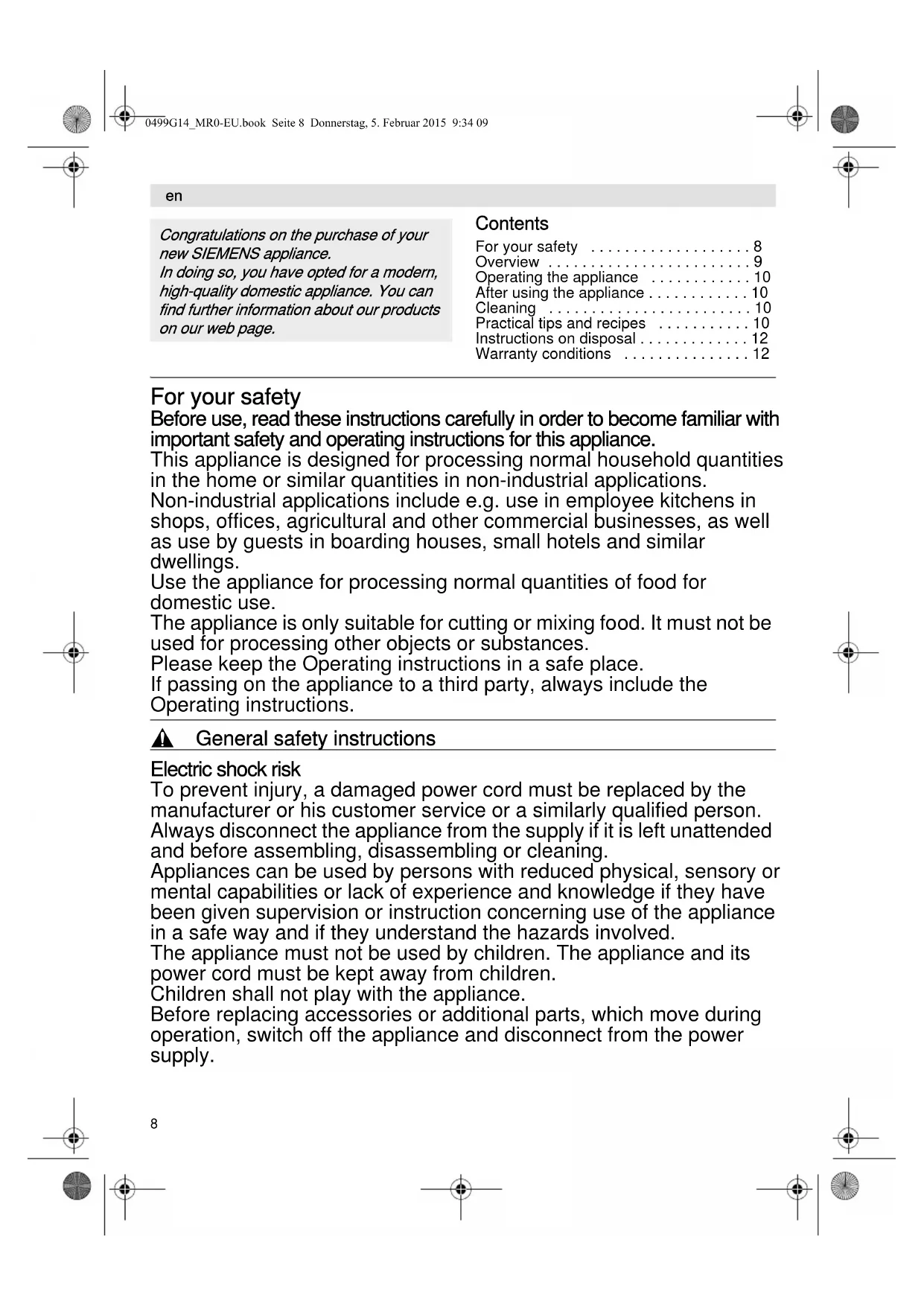 Congratulations on the purchase of your new SIEMENS appliance. In doing so, you have opted for a modern, high-quality domestic appliance. You can find further information about our products on our web page. 0499G14_MR0-EU.book Seite 8 Donnerstag, 5. Februar 2015 9:34 099 Care shall be taken when handling the sharp cutting blades, emptying the bowl and during cleaning. Connect and operate the appliance only in accordance with the speci- fications on the rating plate. Do not use the appliance if the power cord and/or appliance are damaged. Do not place the power cord over sharp edges or hot surfaces. To prevent injury, a damaged power cord must be replaced by the manufacturer or his customer service or a similarly qualified person. Only our customer service may repair the appliance. , Safety instructions for this appliance Risk of injury Electric shock risk Operate the appliance with original accessories only. Do not place the jug on a hot base. Caution when processing hot liquids. Liquids may splash during processing. Do not operate the appliance with wet hands, do not place under running water and do not immerse in liquid. Do not remove the motor unit until the jug has come to a standstill. Never run the appliance at no-load. Risk of injury from sharp blades! Take hold of the blades by the plastic handle only. When switched off the appliance continues running briefly. Risk of scalding! Add and process max. 0.5 litre of frothing or hot liquid in a plastic jug or
