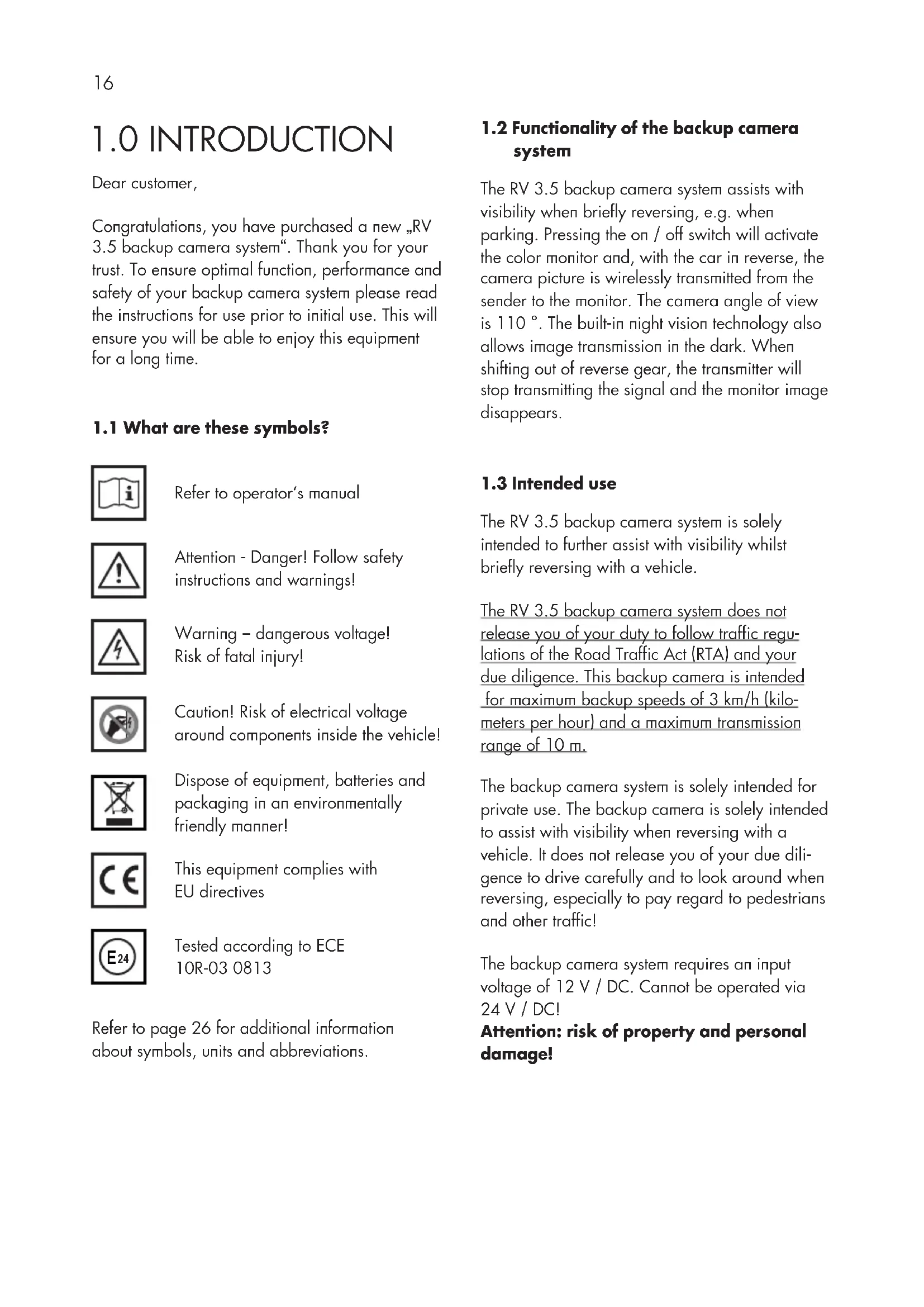 GB 15 97152_Rckfahrkamera_RV3.5_ Manual _07_03_12_Print Mittwoch, 7. Mrz 2012 11:42:16The RV 3.5 backup camera system is solely intended to further assist with visibility whilst briefly reversing with a vehicle. The RV 3.5 backup camera system does not release you of your duty to follow traffic regu- lations of the Road Traffic Act (RTA) and your due diligence. This backup camera is intended for maximum backup speeds of 3 km/h (kilo- meters per hour) and a maximum transmission range of 10 m. The backup camera system is solely intended for private use. The backup camera is solely intended to assist with visibility when reversing with a vehicle. It does not release you of your due dili- gence to drive carefully and to look around when reversing, especially to pay regard to pedestrians and other traffic! The backup camera system requires an input voltage of 12 V / DC. Cannot be operated via 24 V / DC! Attention: risk of property and personal damage!