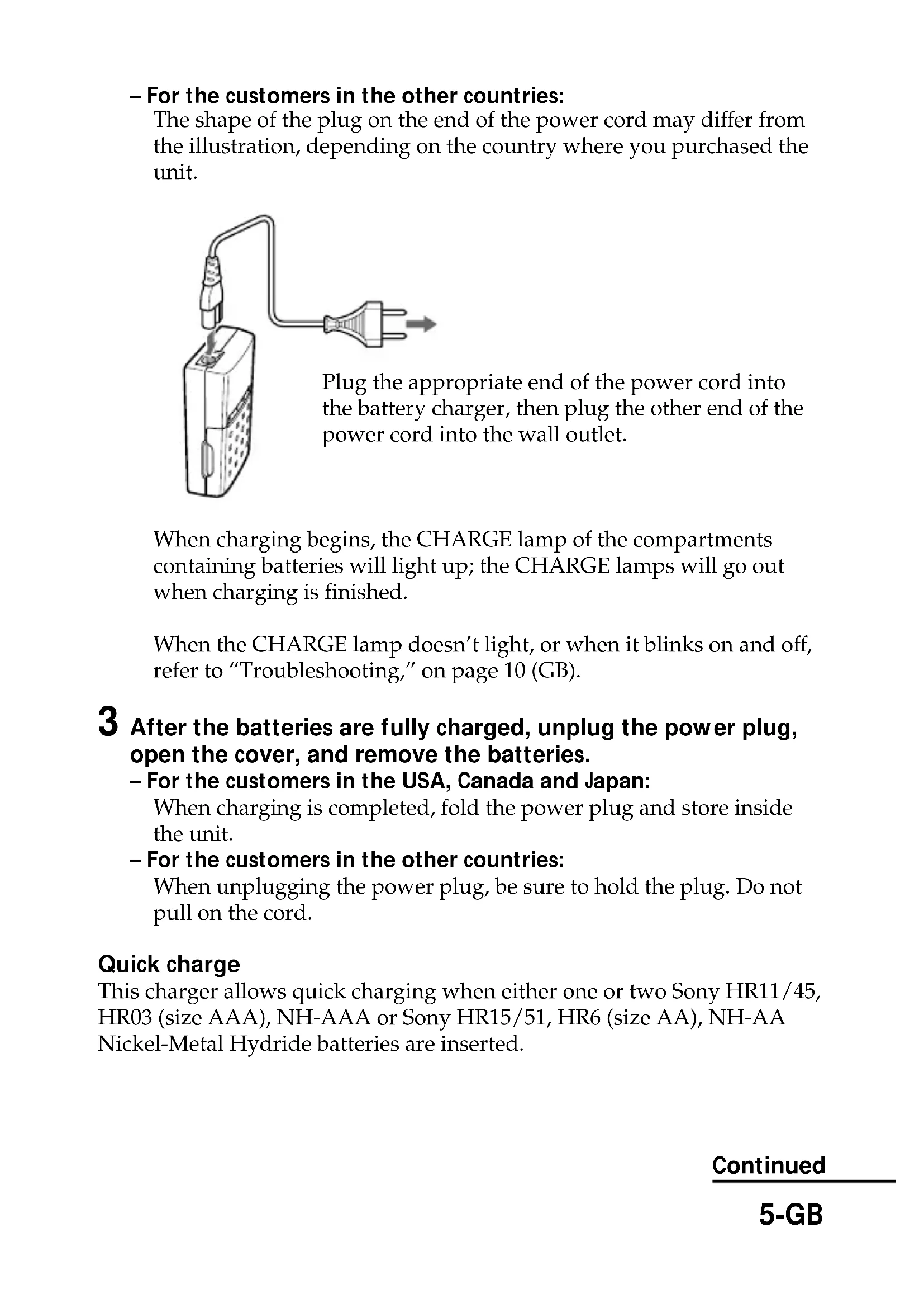 - In this document, the word batteries refers to rechargeable batteries. Table of Contents Identifying the parts ............................................................................................. 4 Charging the batteries.......................................................................................... 4 Precautions ............................................................................................................ 6 Using Nickel-Metal Hydride batteries .............................................................. 9 Troubleshooting .................................................................................................. 10 Specifications ....................................................................................................... 115-GB – For the customers in the other countries: The shape of the plug on the end of the power cord may differ from the illustration, depending on the country where you purchased the unit. When charging begins, the CHARGE lamp of the compartments containing batteries will light up; the CHARGE lamps will go out when charging is finished. When the CHARGE lamp doesn’t light, or when it blinks on and off, refer to “Troubleshooting,” on page 10 (GB). 3 After the batteries are fully charged, unplug the power plug, open the cover, and remove the batteries. – For the customers in the USA, Canada and Japan: When charging is completed, fold the power plug and store inside the unit. – For the customers in the other countries: When unplugging the power plug, be sure to hold the plug. Do not pull on the cord. Quick charge This charger allows quick charging when either one or two Sony HR11/45, HR03 (size AAA), NH-AAA or Sony HR15/51, HR6 (size AA), NH-AA Nickel-Metal Hydride batteries are inserted. Plug the appropriate end of the power cord into the battery charger, then plug the other end of the power cord into the wall outlet. Continued6-GB Precautions