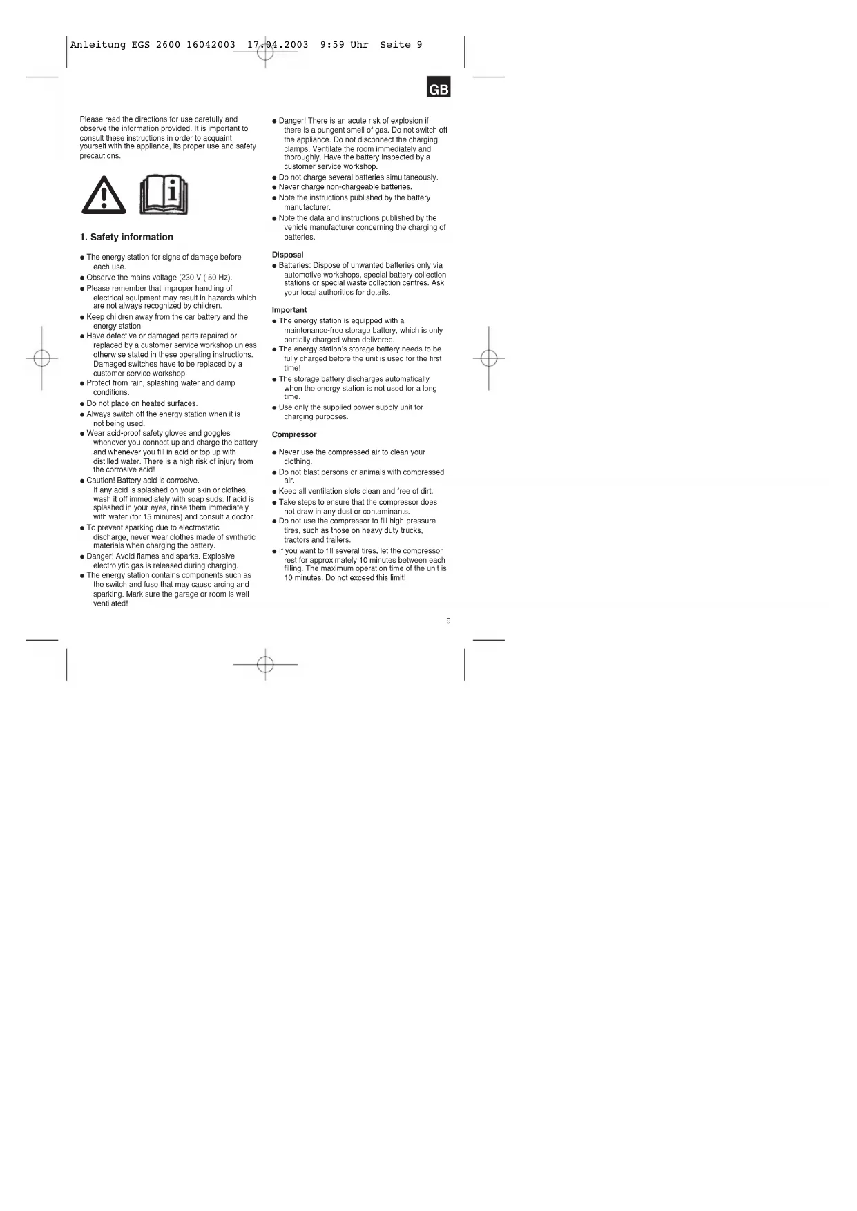 The energy station for signs of damage before each use. Observe the mains voltage (230 V ( 50 Hz). Please remember that improper handling of electrical equipment may result in hazards whichare not always recognized by children. Keep children away from the car battery and the energy station. Have defective or damaged parts repaired or replaced by a customer service workshop unlessotherwise stated in these operating instructions.Damaged switches have to be replaced by acustomer service workshop. Protect from rain, splashing water and damp conditions. Do not place on heated surfaces. Always switch off the energy station when it is not being used. Wear acid-proof safety gloves and goggles whenever you connect up and charge the batteryand whenever you fill in acid or top up withdistilled water. There is a high risk of injury fromthe corrosive acid! Caution! Battery acid is corrosive. If any acid is splashed on your skin or clothes,wash it off immediately with soap suds. If acid issplashed in your eyes, rinse them immediatelywith water (for 15 minutes) and consult a doctor. To prevent sparking due to electrostatic discharge, never wear clothes made of syntheticmaterials when charging the battery. Danger! Avoid flames and sparks. Explosive electrolytic gas is released during charging. The energy station contains components such as the switch and fuse that may cause arcing andsparking. Mark sure the garage or room is wellventilated! Danger! There is an acute risk of explosion if there is a pungent smell of gas. Do not switch offthe appliance. Do not disconnect the chargingclamps. Ventilate the room immediately andthoroughly. Have the battery inspected by acustomer service workshop. Do not charge several batteries simultaneously. Never charge non-chargeable batteries. Note the instructions published by the battery manufacturer. Note the data and instructions published by the vehicle manufacturer concerning the charging ofbatteries.Disposal Batteries: Dispose of unwanted batteries only via automotive workshops, special battery collectionstations or special waste collection centres. Askyour local authorities for details.Important The energy station is equipped with a maintenance-free storage battery, which is onlypartially charged when delivered. The energy station’s storage battery needs to be fully charged before the unit is used for the firsttime! The storage battery discharges automatically when the energy station is not used for a longtime. Use only the supplied power supply unit for charging purposes.Compressor Never use the compressed air to clean your clothing. Do not blast persons or animals with compressed air. Keep all ventilation slots clean and free of dirt. Take steps to ensure that the compressor does not draw in any dust or contaminants. Do not use the compressor to fill high-pressure tires, such as those on heavy duty trucks,tractors and trailers. If you want to fill several tires, let the compressor rest for approximately 10 minutes between eachfilling. The maximum operation time of the unit is10 minutes. Do not exceed this limit!