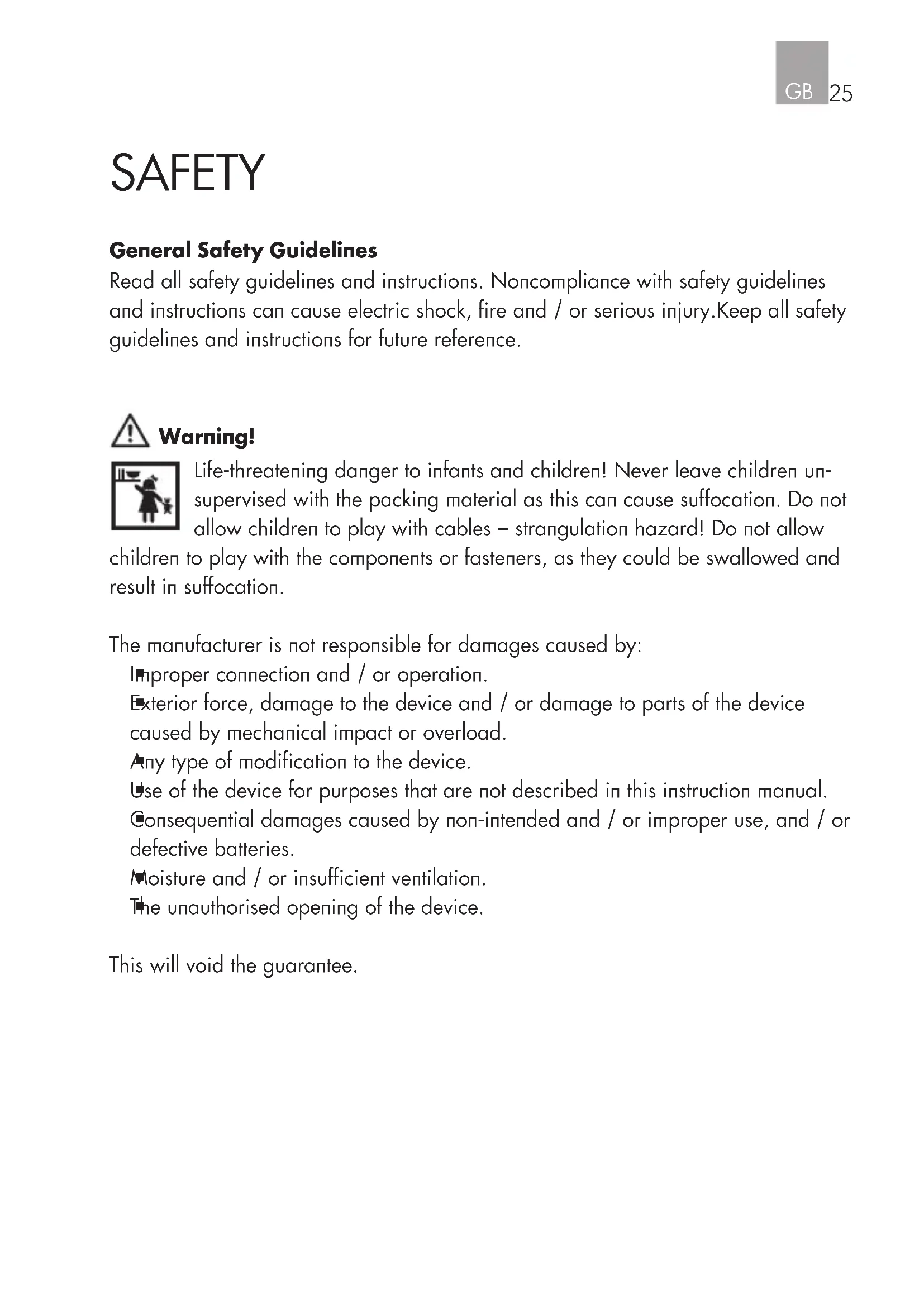 SAFETY General Safety Guidelines Read all safety guidelines and instructions. Noncompliance with safety guidelines and instructions can cause electric shock, fire and / or serious injury.Keep all safety guidelines and instructions for future reference. Warning! Life-threatening danger to infants and children! Never leave children un- supervised with the packing material as this can cause suffocation. Do not allow children to play with cables – strangulation hazard! Do not allow children to play with the components or fasteners, as they could be swallowed and result in suffocation. The manufacturer is not responsible for damages caused by: