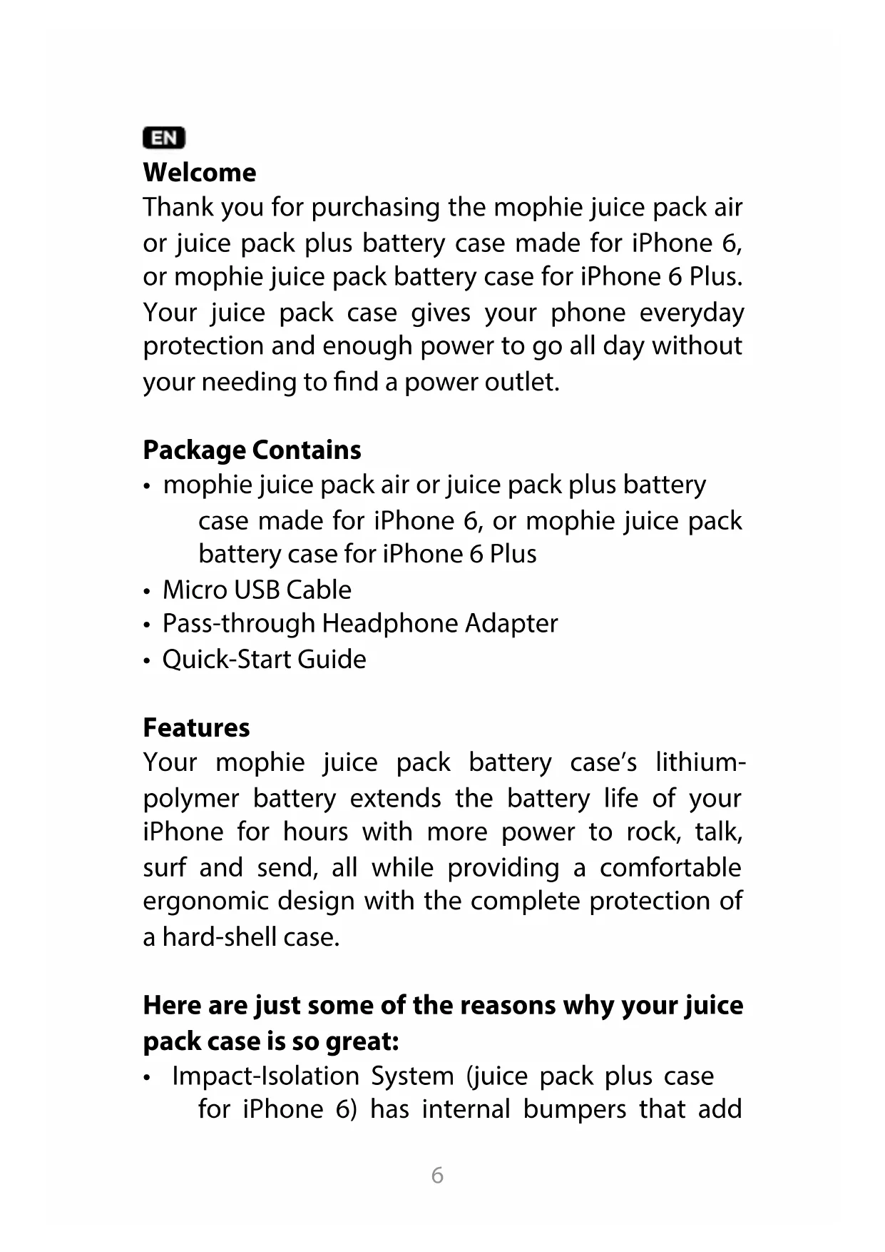 Thank you for purchasing the mophie juice pack air or juice pack plus battery case made for iPhone 6, or mophie juice pack battery case for iPhone 6 Plus. Your juice pack case gives your phone everyday protection and enough power to go all day without your needing to find a power outlet.