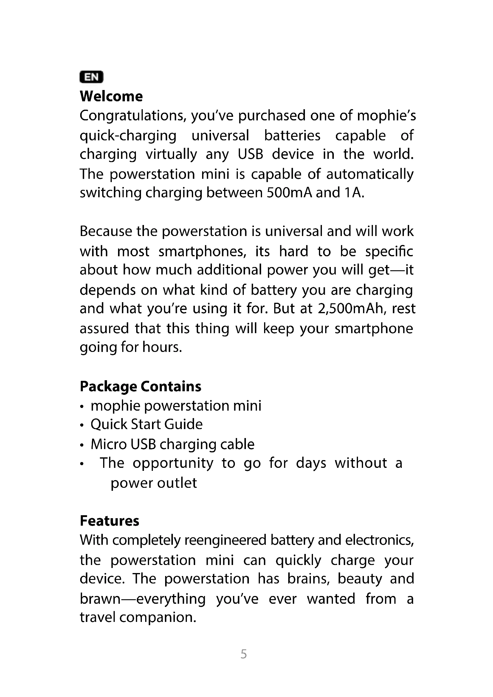 Congratulations, you've purchased one of mophie's quick-charging universal batteries capable of charging virtually any USB device in the world. The workstation mini is capable of automatically switching charging between 500mA and 1A.