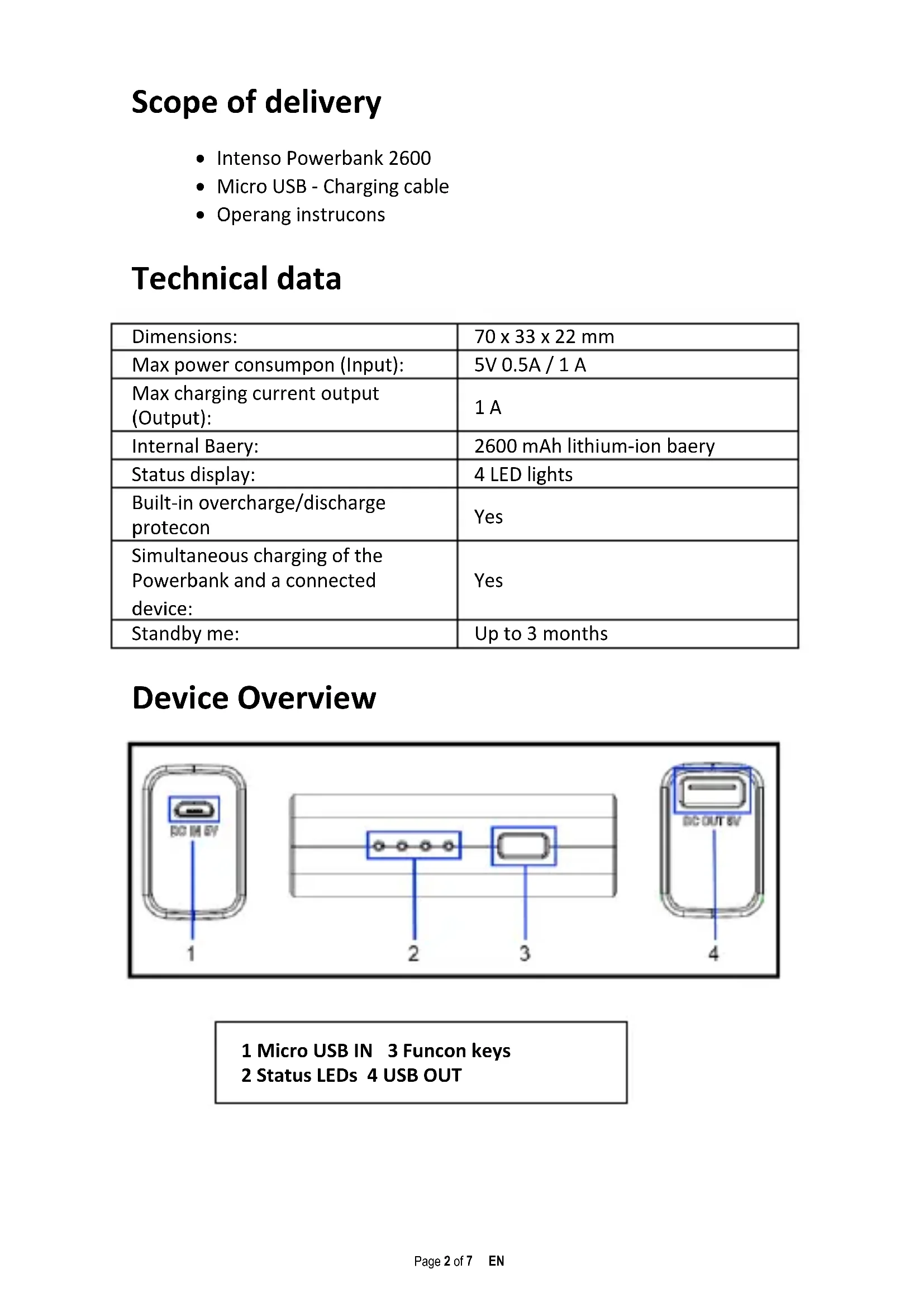 POWERBANK 2600Page 2 of 7 EN Scope of delivery Intenso Powerbank 2600 Micro USB - Charging cable Operating instructions Technical data Dimensions: 70 x 33 x 22 mm Max power consumption (Input): 5V 0.5A / 1 A Max charging current output (Output): 1 A Internal Battery: 2600 mAh lithium-ion battery Status display: 4 LED lights Built-in overcharge/discharge protection Yes Simultaneous charging of the Powerbank and a connected device: Yes Standby time: Up to 3 months