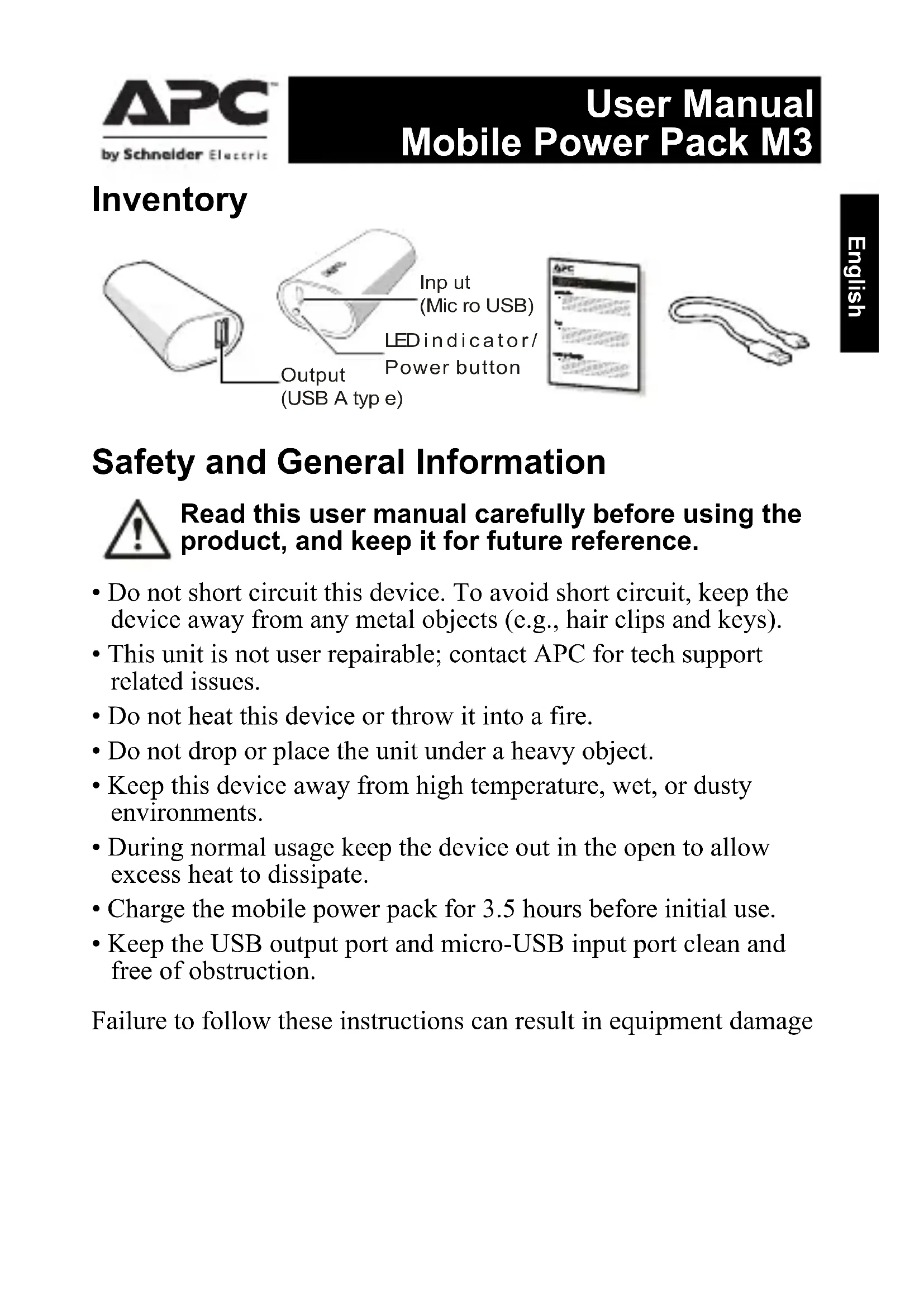 F)© 2015 APC by Schneider Electric. APC, and the APC logo, are owned by Schneider Electric Industries S.A.S., or their affiliated companies. All other trademarks are property of their respective owners. EN 990-5593 01/2015 English Troubleshooting APC by Schneider Electric IT Customer Support Worldwide For country specific customer support, go to the APC by Schneider Electric Web site, www.apc.com. Problem / Possible Cause Solution The mobile power pack cannot be charged USB charger may be malfunctioning or the computer is in sleep mode. Try another USB charger or wake the computer from sleep mode. The micro USB cable and connector contacts have worn out. Try a new micro USB connector The mobile power pack cannot charge some devices. The mobile power pack may have failed to recognize and detect the devices connected to it. Some after market USB cables may not work well with the M3 battery pack. To resolve this issue, press the power button on the M3 to start charging the device. If the battery pack still won't charge your device, replace the after market cable with the original cable that came with your device. An overload condition has occurred and the M3 Orange LED is flashing. The M3 is charging a device and its USB output current exceeds the specified range. Detach the device being charged from the M3 power pack. The life of the mobile power pack has expired or a fault has occurred in it. In case of a system fault, contact your local APC by Schneider Electric dealer or authorized APC by Schneider Electric service agency.Deutsch Lieferumfang Sicherheitsanweisungen und allgemeine Informationen Lesen Sie diese Bedienungsanleitung vor der Verwendung des Produkts sorgfältig durch und heben Sie sie zur künftigen Bezugnahme auf.