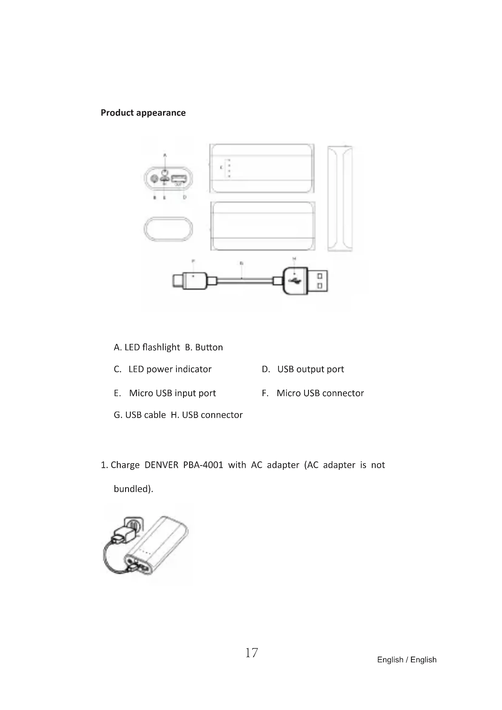 English / English2. Charge DENVER PBA-4001 by connecng it to USB port on computer.