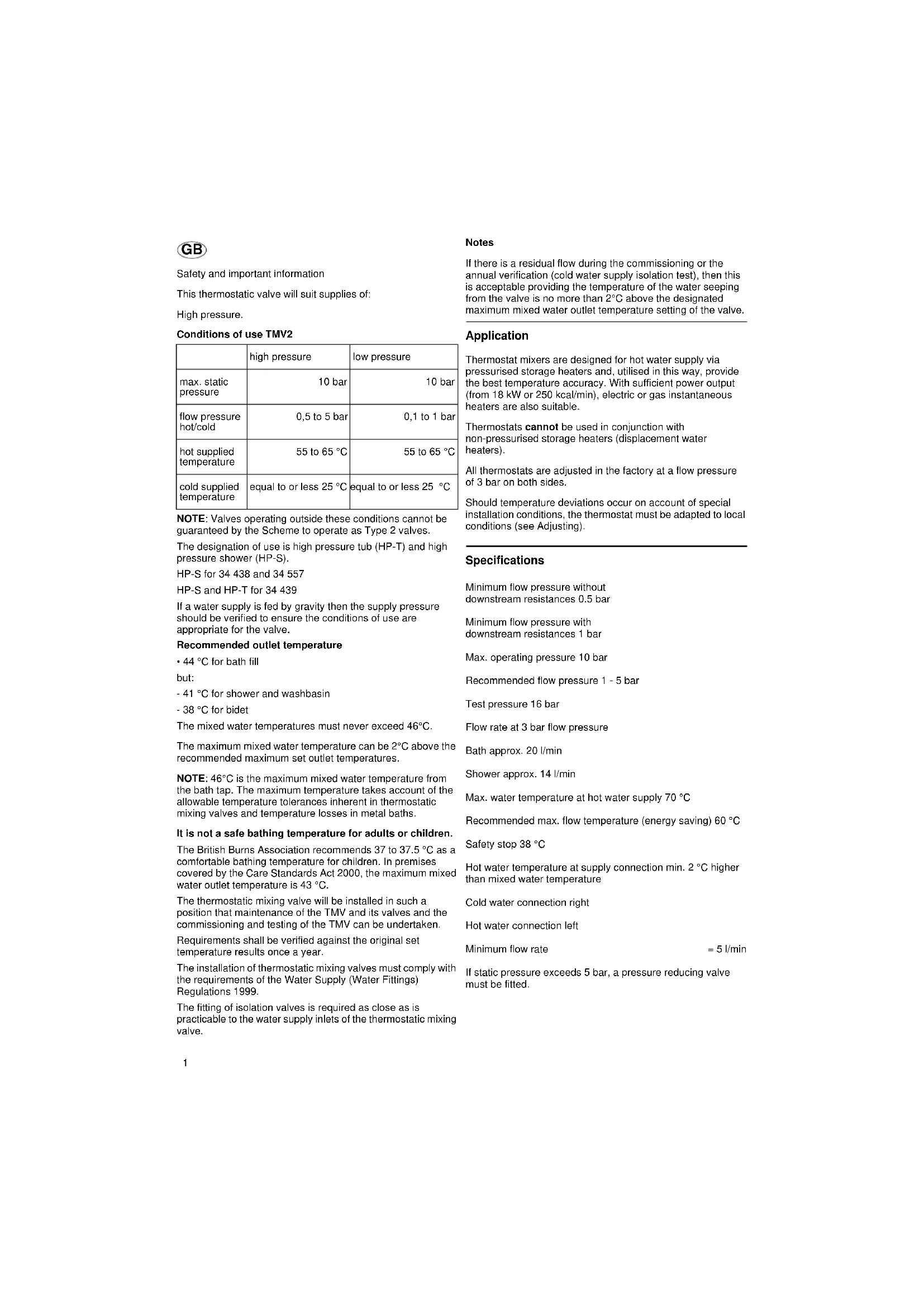Safety and important information This thermostatic valve will suit supplies of: High pressure. Conditions of use TMV2 NOTE: Valves operating outside these conditions cannot be guaranteed by the Scheme to operate as Type 2 valves. The designation of use is high pressure tub (HP-T) and high pressure shower (HP-S). HP-S for 34 438 and 34 557 HP-S and HP-T for 34 439 If a water supply is fed by gravity then the supply pressure should be verified to ensure the conditions of use are appropriate for the valve. Recommended outlet temperature