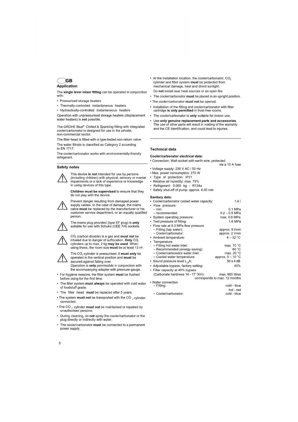 Chilled & Sparkling fitting with integrated cooler/carbonator is designed for use in the private, non-commercial sector. The filter head is fitted with a type-tested non-return valve. The water filtrate is classified as Category 2 according to EN 1717. The cooler/carbonator works with environmentally-friendly refrigerant. Safety notes This device is not intended for use by persons (including children) with physical, sensory or mental impairments or a lack of experience or knowledge in using devices of this type. Children must be supervised to ensure that they do not play with the device. Prevent danger resulting from damaged power supply cables. In the case of damage, the mains cable must be replaced by the manufacturer or his customer service department, or an equally qualified person. The mains plug provided (type EF plug) is only suitable for use with Schuko (CEE 7/4) sockets.