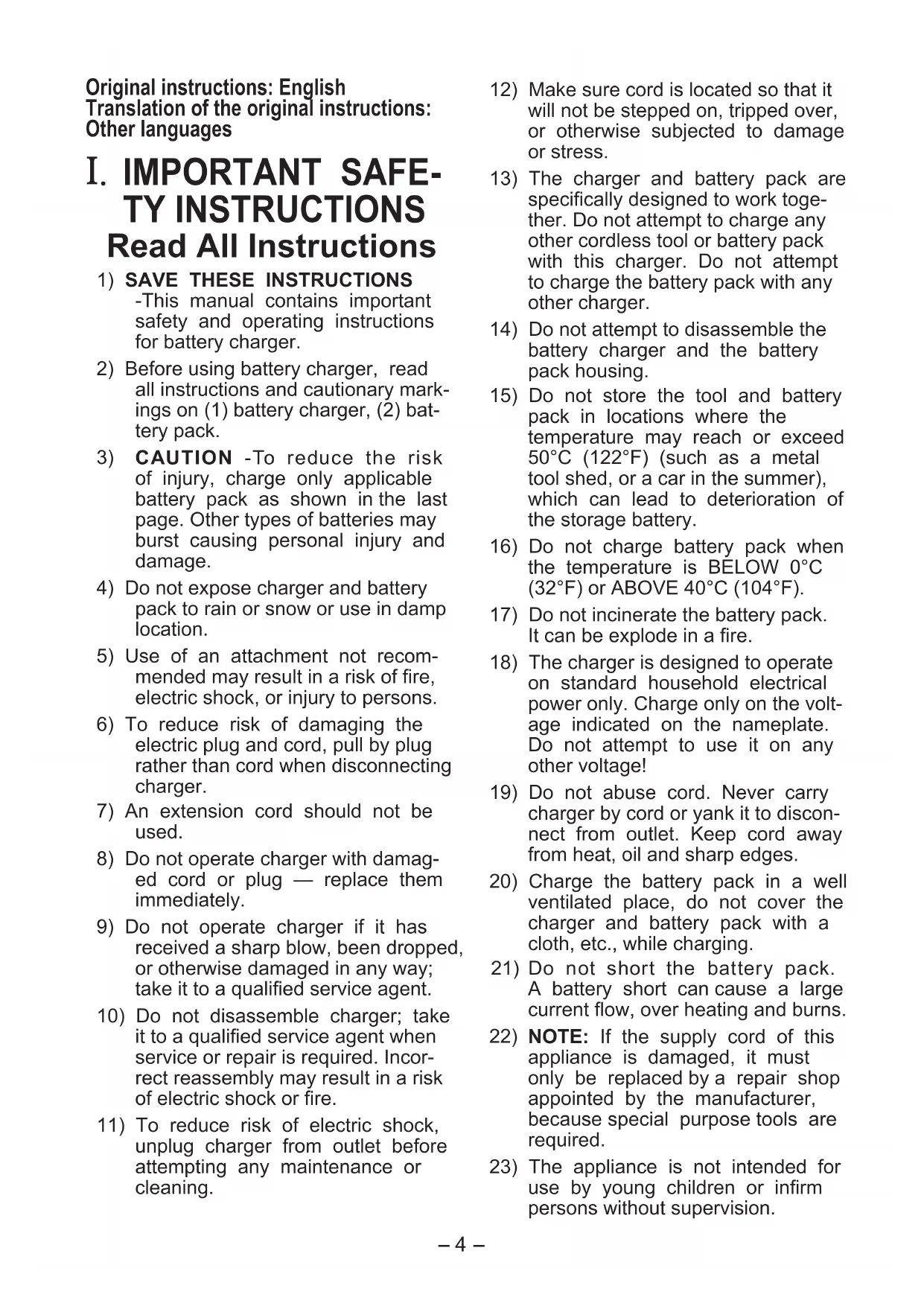 IMPORTANT SAFE- TY INSTRUCTIONS Read All Instructions 1) SAVE THESE INSTRUCTIONS -This manual contains important safety and operating instructions for battery charger. 2) Before using battery charger, read all instructions and cautionary mark-ings on (1) battery charger, (2) bat-tery pack. 3) CAUTION -To reduce the risk of injury, charge only applicable battery pack as shown in the last page. Other types of batteries may burst causing personal injury and damage. 4) Do not expose charger and battery pack to rain or snow or use in damp location. 5) Use of an attachment not recom-mended may result in a risk of fire, electric shock, or injury to persons. 6) To reduce risk of damaging the electric plug and cord, pull by plug rather than cord when disconnecting charger. 7) An extension cord should not be used. 8) Do not operate charger with damag-ed cord or plug — replace them immediately. 9) Do not operate charger if it has received a sharp blow, been dropped, or otherwise damaged in any way; take it to a qualified service agent. 10) Do not disassemble charger; take it to a qualified service agent when service or repair is required. Incor-rect reassembly may result in a risk of electric shock or fire. 11) To reduce risk of electric shock, unplug charger from outlet before attempting any maintenance or cleaning. 12) Make sure cord is located so that it will not be stepped on, tripped over, or otherwise subjected to damage or stress. 13) The charger and battery pack are specifically designed to work toge-ther. Do not attempt to charge any other cordless tool or battery pack with this charger. Do not attempt to charge the battery pack with any other charger. 14) Do not attempt to disassemble the battery charger and the battery pack housing. 15) Do not store the tool and battery pack in locations where the temperature may reach or exceed 50°C (122°F) (such as a metal tool shed, or a car in the summer), which can lead to deterioration of the storage battery. 16) Do not charge battery pack when the temperature is BELOW 0°C (32°F) or ABOVE 40°C (104°F). 17) Do not incinerate the battery pack. It can be explode in a fire. 18) The charger is designed to operate on standard household electrical power only. Charge only on the volt-age indicated on the nameplate. Do not attempt to use it on any other voltage! 19) Do not abuse cord. Never carry charger by cord or yank it to discon-nect from outlet. Keep cord away from heat, oil and sharp edges. 20) Charge the battery pack in a well ventilated place, do not cover the charger and battery pack with a cloth, etc., while charging.
