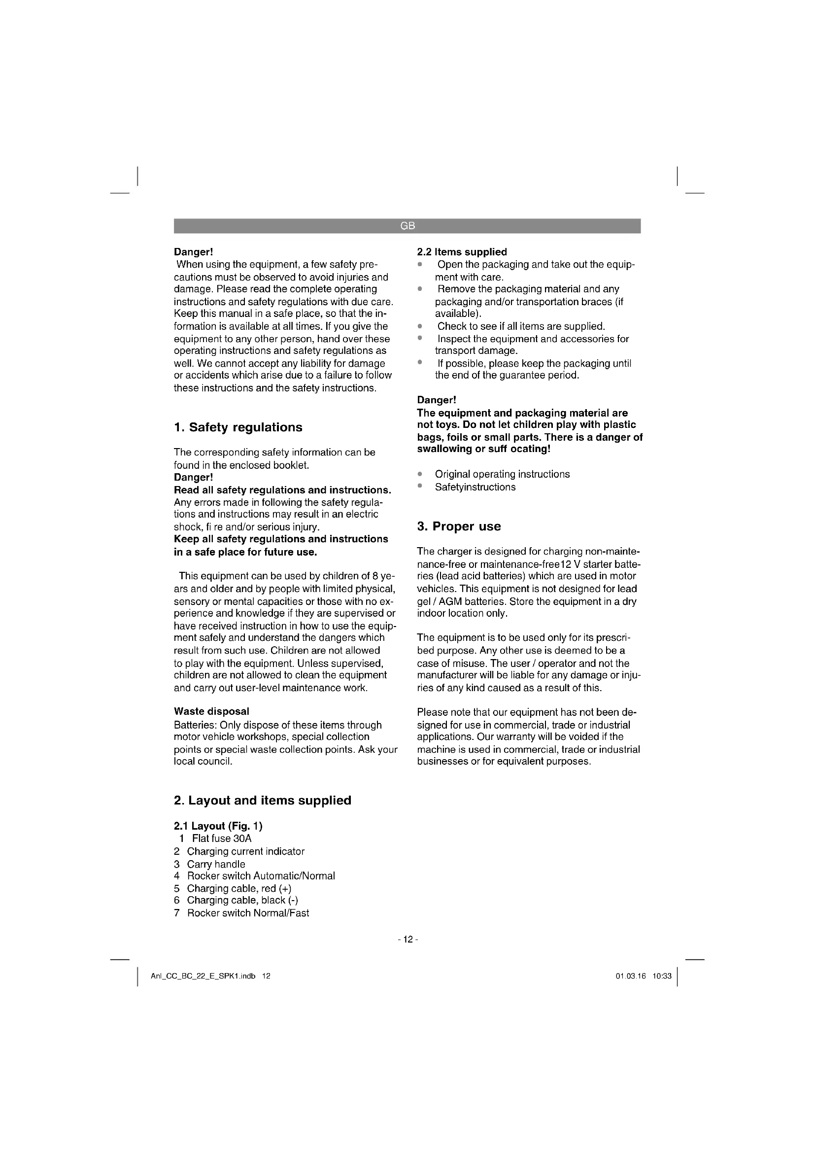 The charger is designed for charging non-mainte- nance-free or maintenance-free12 V starter batte- ries (lead acid batteries) which are used in motor vehicles. This equipment is not designed for lead gel / AGM batteries. Store the equipment in a dry indoor location only. The equipment is to be used only for its prescri- bed purpose. Any other use is deemed to be a case of misuse. The user / operator and not the manufacturer will be liable for any damage or inju- ries of any kind caused as a result of this. Please note that our equipment has not been de- signed for use in commercial, trade or industrial applications. Our warranty will be voided if the machine is used in commercial, trade or industrial businesses or for equivalent purposes. Anl_CC_BC_22_E_SPK1.indb 12Anl_CC_BC_22_E_SPK1.indb 12 01.03.16 10:3301.03.16 10:33GB