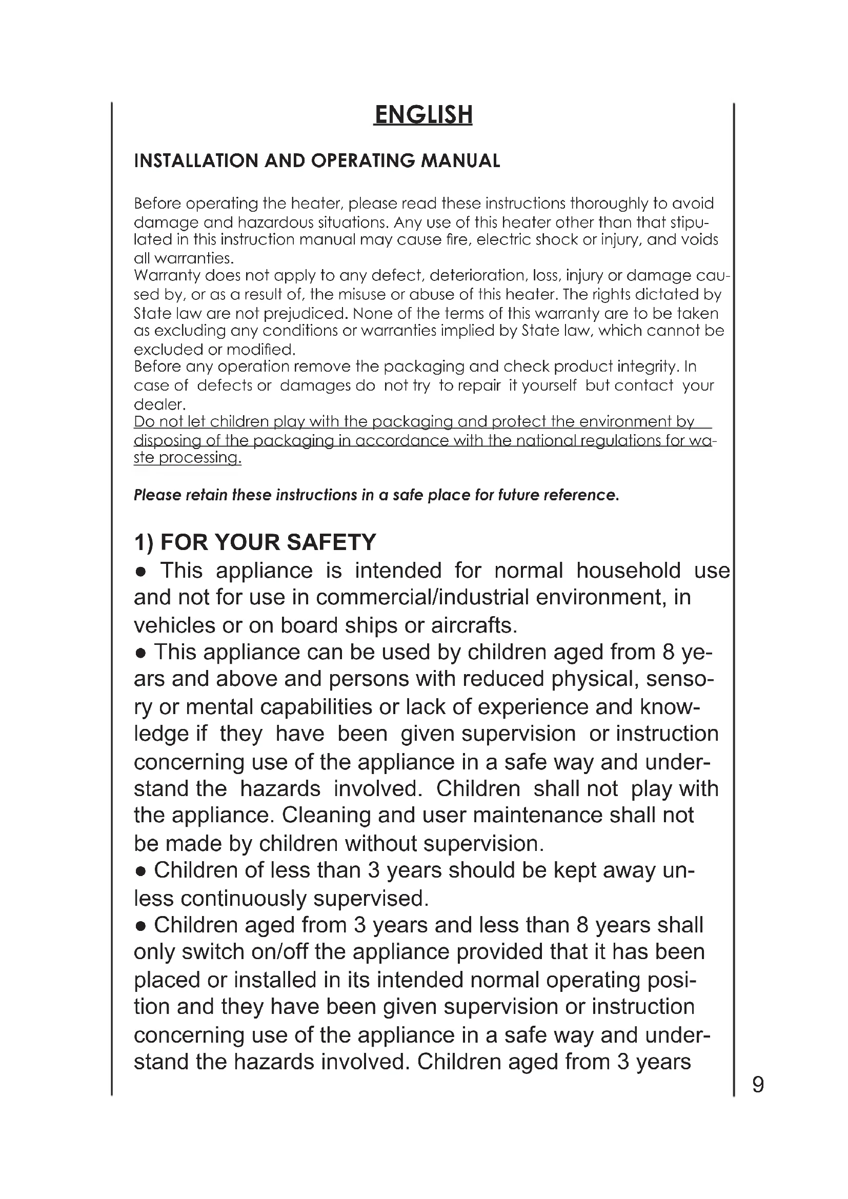 - WARNING: the product is not equipped with a device to control the room temperature. Do not use the heating in small rooms when they are occupied by persons not capable of leaving the room on their own, unless constant supervision is provided by a person responsible for their safety.