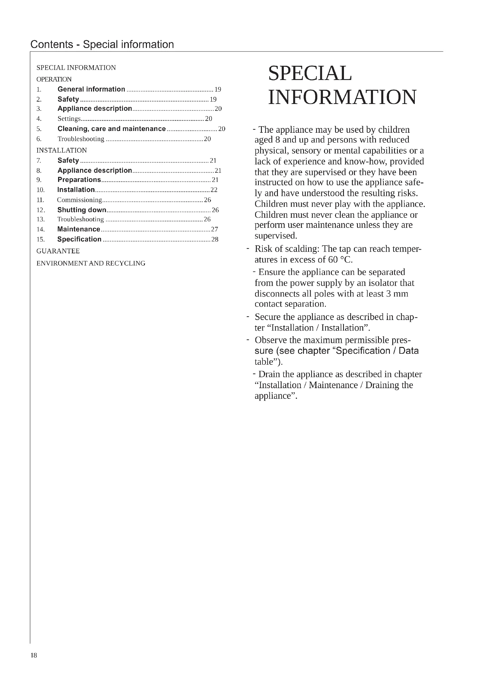 SPECIAL INFORMATION - The appliance may be used by children aged 8 and up and persons with reduced physical, sensory or mental capabilities or a lack of experience and know-how, provided that they are supervised or they have been instructed on how to use the appliance safe- ly and have understood the resulting risks. Children must never play with the appliance. Children must never clean the appliance or perform user maintenance unless they are supervised. - Risk of scalding: The tap can reach temper- atures in excess of 60 °C. - Ensure the appliance can be separated from the power supply by an isolator that disconnects all poles with at least 3 mm contact separation. - Secure the appliance as described in chap- ter “Installation / Installation”. - Observe the maximum permissible pres- sure (see chapter “Specication / Data table”). - Drain the appliance as described in chapter “Installation / Maintenance / Draining the appliance”.19 Operation - for users and qualied contractors OPERATION