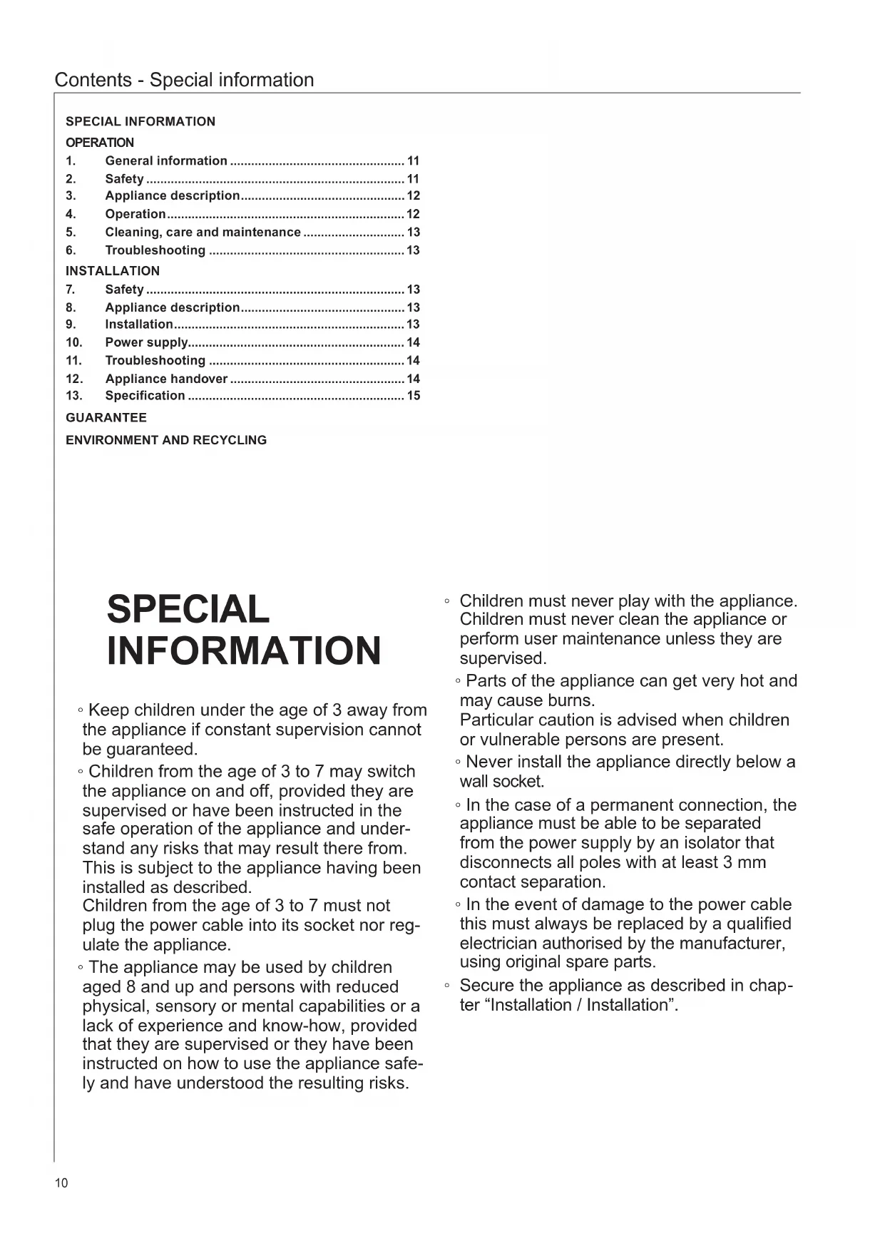 » Explain the functions of the appliance to the user. » Draw special attention to the safety instructions. » Pass on the operating and installation instructions to the user.15 Installation - for contractors GUARANTEE