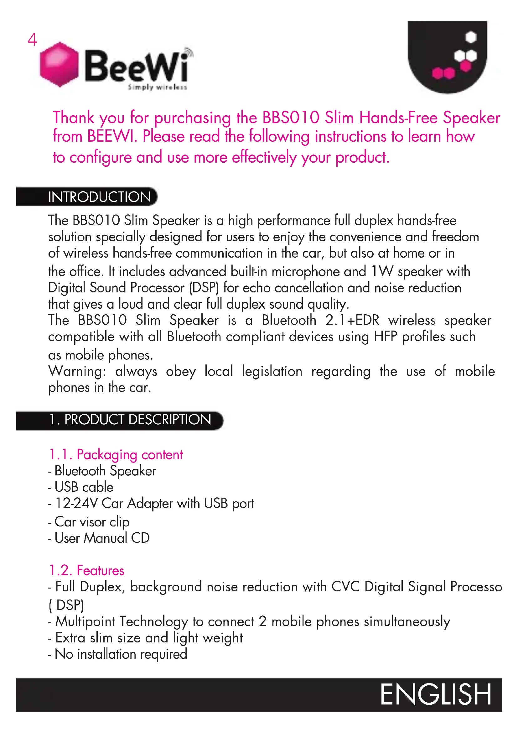 phones in the car. 1.1. Packaging content - Bluetooth Speaker - USB cable - 12-24V Car Adapter with USB port - Car visor clip - User Manual CD 1.2. Features - Full Duplex, background noise reduction with CVC Digital Signal Processor ( DSP) - Multipoint Technology to connect 2 mobile phones simultaneously - Extra slim size and light weight - No installation required INTRODUCTION Thank you for purchasing the BBS010 Slim Hands-Free Speaker from BEEWI. Please read the following instructions to learn how to configure and use more effectively your product. ENGLISH