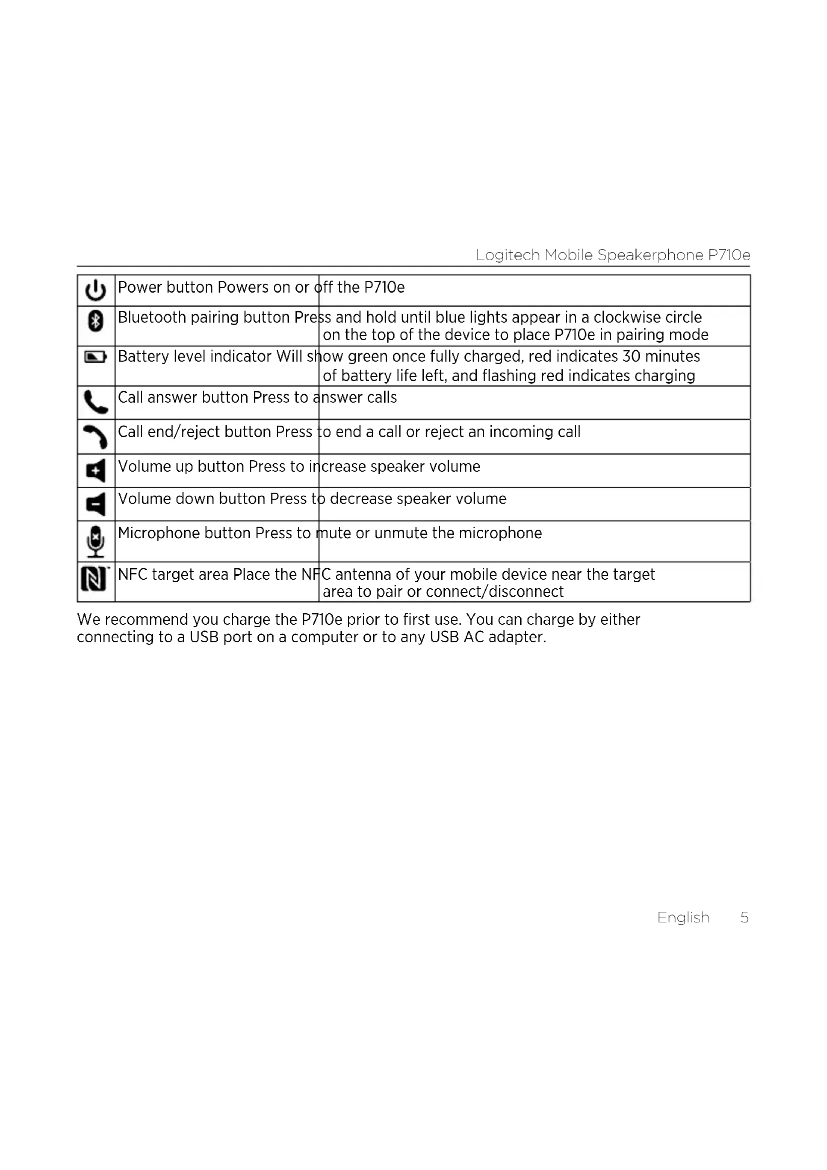 2Logitech Mobile Speakerphone P710e English 5 Power button Powers on or o the P710e Bluetooth pairing button Press and hold until blue lights appear in a clockwise circle on the top of the device to place P710e in pairing mode Battery level indicator Will show green once fully charged, red indicates 30 minutes of battery life left, and flashing red indicates charging Call answer button Press to answer calls Call end/reject button Press to end a call or reject an incoming call Volume up button Press to increase speaker volume Volume down button Press to decrease speaker volume Microphone button Press to mute or unmute the microphone NFC target area Place the NFC antenna of your mobile device near the target area to pair or connect/disconnect We recommend you charge the P710e prior to first use. You can charge by either connecting to a USB port on a computer or to any USB AC adapter.Logitech Mobile Speakerphone P710e 6 English Inserts/sliding top The top of the P710e can be slid back to reveal a concealed stand for your mobile device. This stand is especially useful when using your mobile device for video conferences for greater stability of the image for those on the other end of the call. There is an insert that can be used in the concealed stand to adjust to the size of your mobile device. The insert can be placed in two ways as illustrated. The approximate size of mobile device that will fit in the concealed stand is: Side 2: 0mm–8.5mm Side 1: 8.5mm–10.5mmLogitech Mobile Speakerphone P710e English 7 Initial setup of device