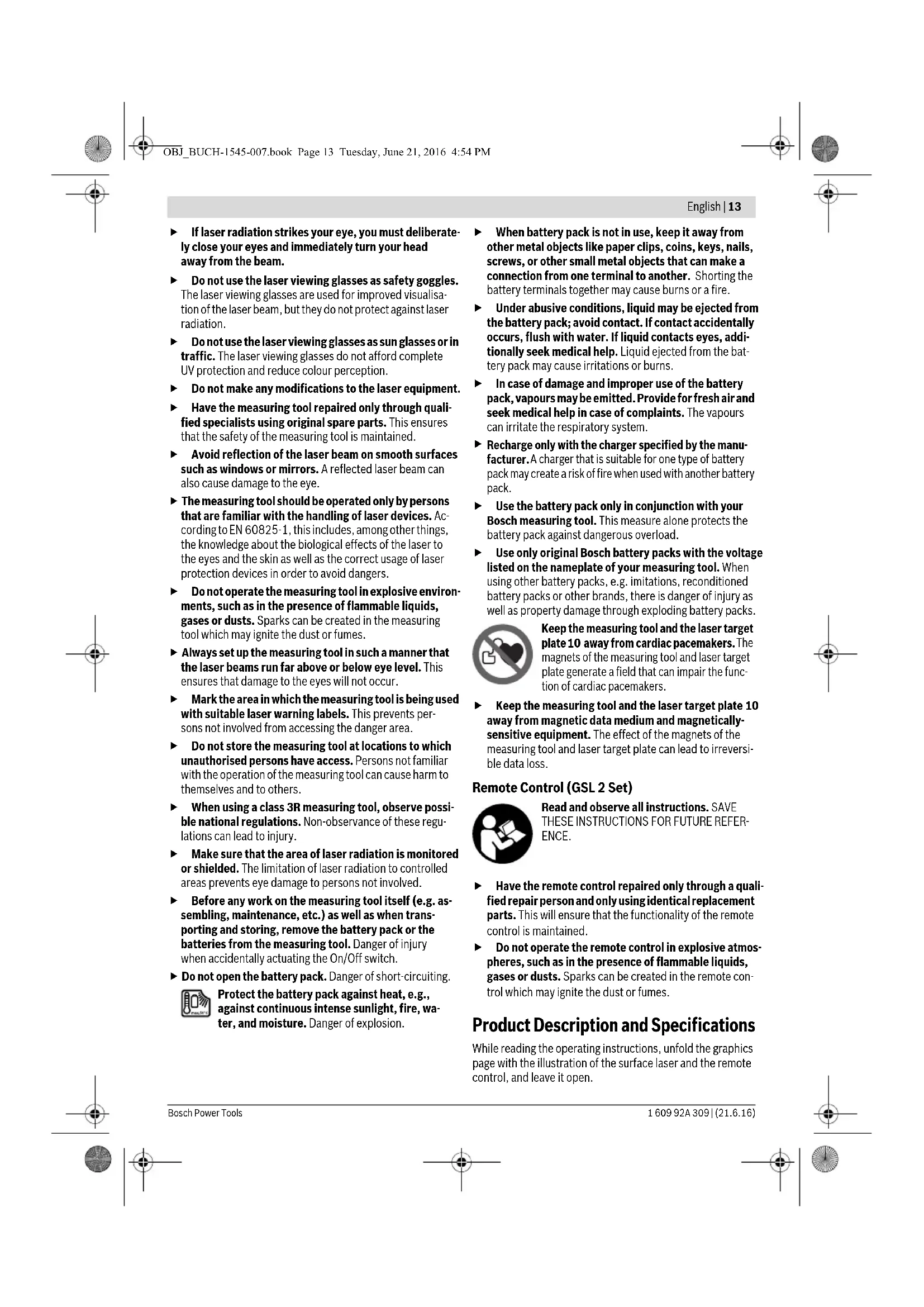ENCE AND INCLUDE THEM WITH THE MEAS- URING TOOL WHEN GIVING IT TO A THIRD PARTY. Caution – The use of other operating or adjusting equipment or the application of other processing meth- ods than those mentioned here can lead to dangerous radiation exposure. The measuring tool is provided with two warning labels (each marked with number 2 in the representation of the measuring tool on the graphics page). If the text of the warning labels is not in your national language, stick the provided warning labels in your na- tional language over it before operating for the first time. Do not direct the laser beam at persons or animals and do not look into the laser beam yourself. This measuring tool gener- ates laser radiation from class 3R according to IEC60825-1. Looking directly into the laser beam – even from a greater distance can cause damages to the eyes. OBJ_BUCH-1545-007.book Page 12 Tuesday, June 21, 2016 4:54 PMEnglish | 13 Bosch Power Tools 1 609 92A 309 | (21.6.16) If laser radiation strikes your eye, you must deliberate- ly close your eyes and immediately turn your head away from the beam. Do not use the laser viewing glasses as safety goggles. The laser viewing glasses are used for improved visualisa- tion of the laser beam, but they do not protect against laser radiation. Do not use the laser viewing glasses as sun glasses or in traffic. The laser viewing glasses do not afford complete UV protection and reduce colour perception. Do not make any modifications to the laser equipment. Have the measuring tool repaired only through quali- fied specialists using original spare parts. This ensures that the safety of the measuring tool is maintained. Avoid reflection of the laser beam on smooth surfaces such as windows or mirrors. A reflected laser beam can also cause damage to the eye. The measuring tool should be operated only by persons that are familiar with the handling of laser devices. Ac- cording to EN 60825-1, this includes, among other things, the knowledge about the biological effects of the laser to the eyes and the skin as well as the correct usage of laser protection devices in order to avoid dangers. Do not operate the measuring tool in explosive environ- ments, such as in the presence of flammable liquids, gases or dusts. Sparks can be created in the measuring tool which may ignite the dust or fumes. Always set up the measuring tool in such a manner that the laser beams run far above or below eye level. This ensures that damage to the eyes will not occur. Mark the area in which the measuring tool is being used with suitable laser warning labels. This prevents per- sons not involved from accessing the danger area. Do not store the measuring tool at locations to which unauthorised persons have access. Persons not familiar with the operation of the measuring tool can cause harm to themselves and to others. When using a class 3R measuring tool, observe possi- ble national regulations. Non-observance of these regu- lations can lead to injury. Make sure that the area of laser radiation is monitored or shielded. The limitation of laser radiation to controlled areas prevents eye damage to persons not involved. Before any work on the measuring tool itself (e.g. as- sembling, maintenance, etc.) as well as when trans- porting and storing, remove the battery pack or the batteries from the measuring tool. Danger of injury when accidentally actuating the On/Off switch. Do not open the battery pack. Danger of short-circuiting. Protect the battery pack against heat, e.g., against continuous intense sunlight, fire, wa- ter, and moisture. Danger of explosion. When battery pack is not in use, keep it away from other metal objects like paper clips, coins, keys, nails, screws, or other small metal objects that can make a connection from one terminal to another. Shorting the battery terminals together may cause burns or a fire. Under abusive conditions, liquid may be ejected from the battery pack; avoid contact. If contact accidentally occurs, flush with water. If liquid contacts eyes, addi- tionally seek medical help. Liquid ejected from the bat- tery pack may cause irritations or burns. In case of damage and improper use of the battery pack, vapours may be emitted. Provide for fresh air and seek medical help in case of complaints. The vapours can irritate the respiratory system.