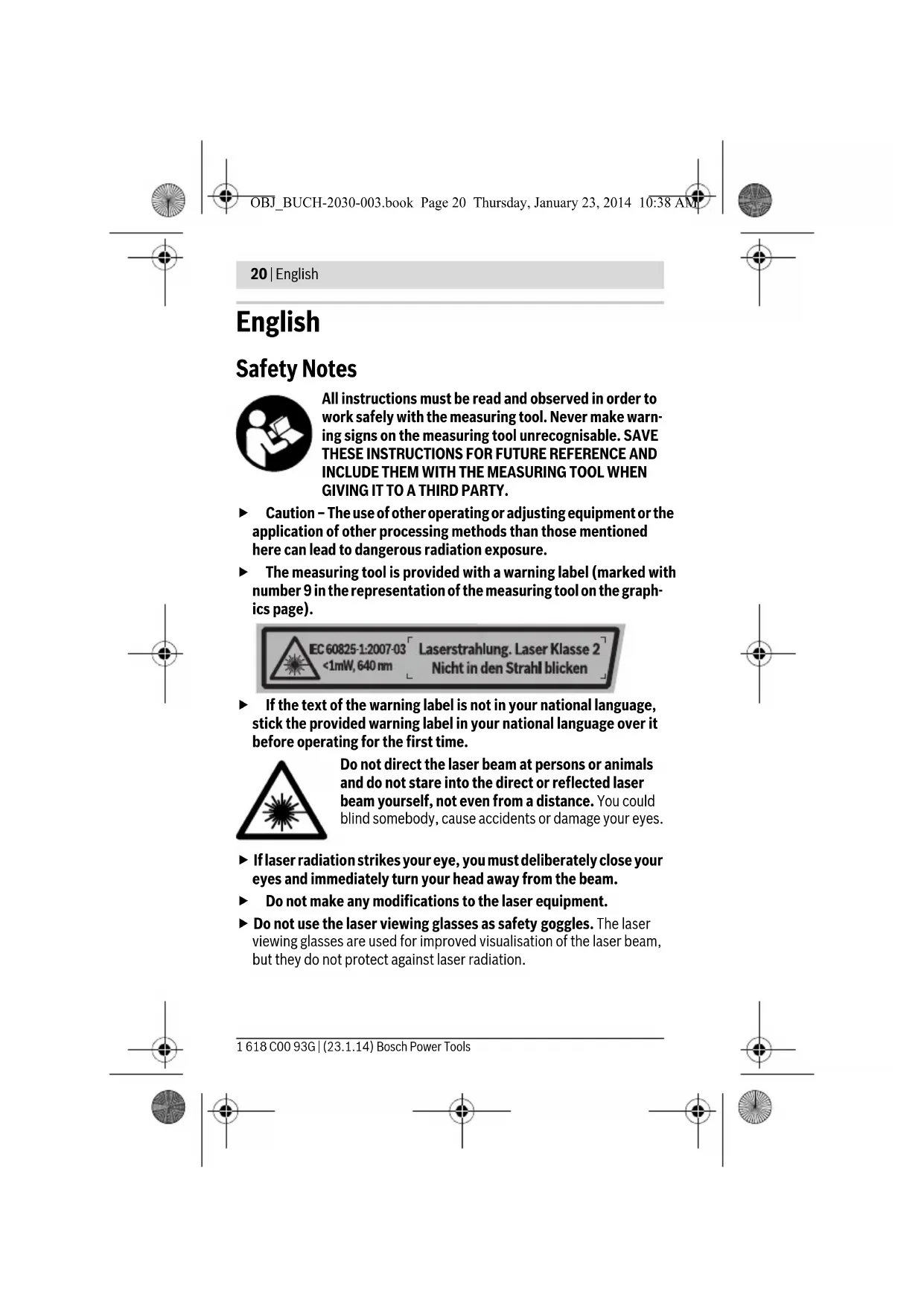 INCLUDE THEM WITH THE MEASURING TOOL WHEN GIVING IT TO A THIRD PARTY. Caution – The use of other operating or adjusting equipment or the application of other processing methods than those mentioned here can lead to dangerous radiation exposure. The measuring tool is provided with a warning label (marked with number 9 in the representation of the measuring tool on the graph- ics page). If the text of the warning label is not in your national language, stick the provided warning label in your national language over it before operating for the first time. Do not direct the laser beam at persons or animals and do not stare into the direct or reflected laser beam yourself, not even from a distance. You could blind somebody, cause accidents or damage your eyes. If laser radiation strikes your eye, you must deliberately close your eyes and immediately turn your head away from the beam. Do not make any modifications to the laser equipment. Do not use the laser viewing glasses as safety goggles. The laser viewing glasses are used for improved visualisation of the laser beam, but they do not protect against laser radiation. OBJ_BUCH-2030-003.book Page 20 Thursday, January 23, 2014 10:38 AMEnglish | 21 Bosch Power Tools 1 618 C00 93G | (23.1.14) Do not use the laser viewing glasses as sun glasses or in traffic. The laser viewing glasses do not afford complete UV protection and reduce colour perception. Have the measuring tool repaired only through qualified special- ists using original spare parts. This ensures that the safety of the measuring tool is maintained. Do not allow children to use the laser measuring tool without su- pervision. They could unintentionally blind other persons or them- selves. Do not operate the measuring tool in explosive environments, such as in the presence of flammable liquids, gases or dusts. Sparks can be created in the measuring tool which may ignite the dust or fumes. Keep the measuring tool away from cardiac pace- makers. The magnet inside the measuring tool gener- ates a field that can impair the function of cardiac pace- makers. Keep the measuring tool away from magnetic data media and mag- netically-sensitive equipment. The effect of the magnet can lead to irreversible data loss. Product Description and Specifications Intended Use The measuring tool is intended to determine and check horizontal and vertical lines as well as lines at a defined angle. Moreover, the measuring tool is intended to determine the angles of objects. The measuring tool is suitable exclusively for operation in enclosed work- ing sites. The measuring tool is not intended for commercial use. OBJ_BUCH-2030-003.book Page 21 Thursday, January 23, 2014 10:38 AM22 | English 1 618 C00 93G | (23.1.14) Bosch Power Tools Product Features The numbering of the product features shown refers to the illustration of the measuring tool on the graphic page. 1 Laser line 2Mode button 3Cal calibration button 4 Display 5 On/Off switch 6 Tripod mount 1/4" 7 Battery lid 8 Latch of battery lid 9 Laser warning label 10 Serial number 11 Laser target plate 12 Tripod* 13 Protective pouch 14 Laser viewing glasses*